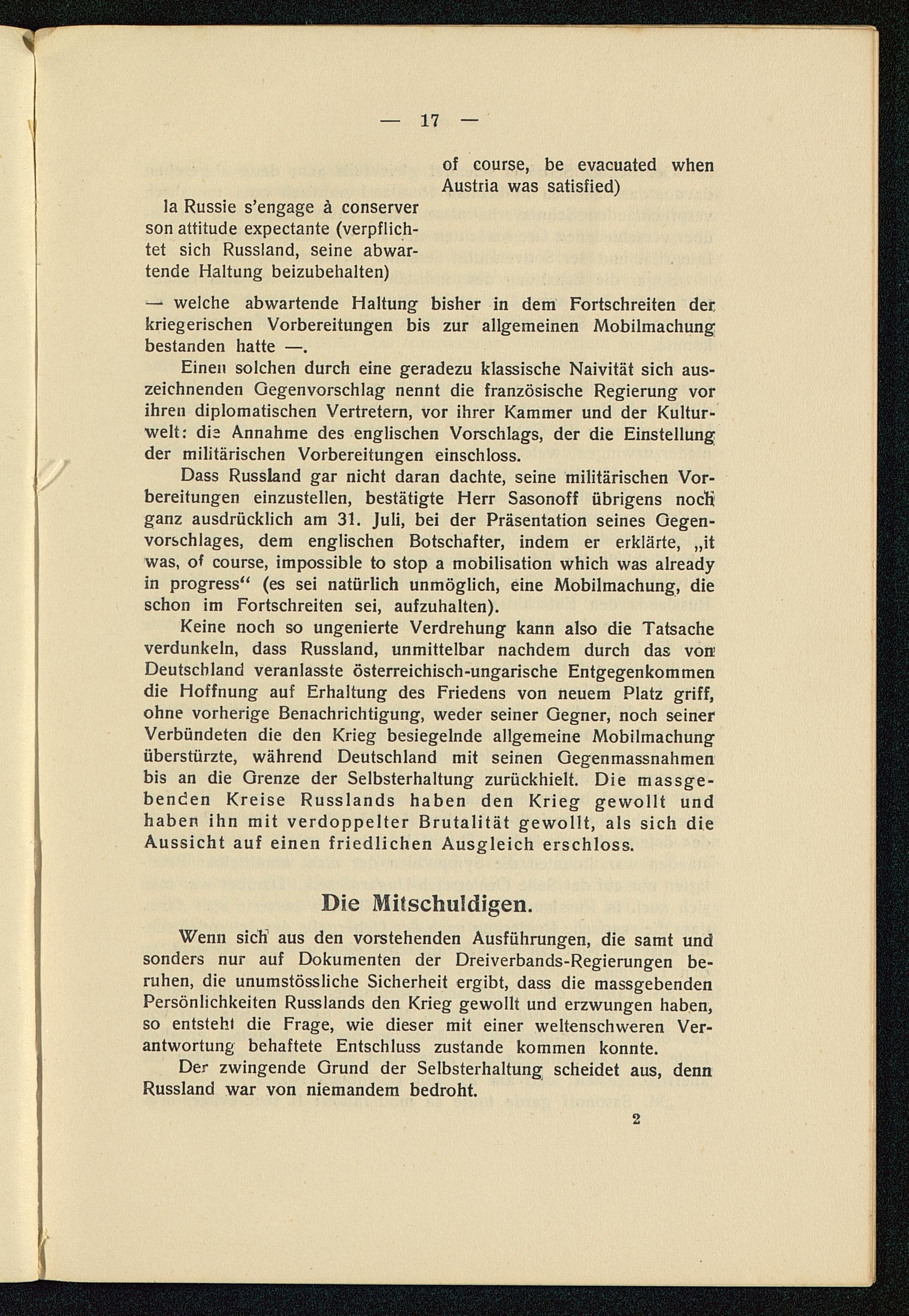 1) Die allgemeine russische Mobilmachung als Antwort auf die militärischen Massnahmen Oesterreich-Ungarns.