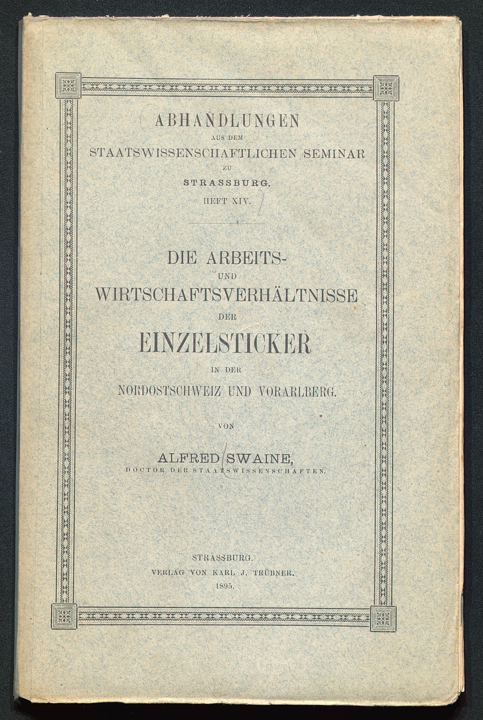 Die Arbeits- und Wirtschaftsverhältnisse der Einzelsticker in der Nordostschweiz und Vorarlberg / von Alfred Swaine