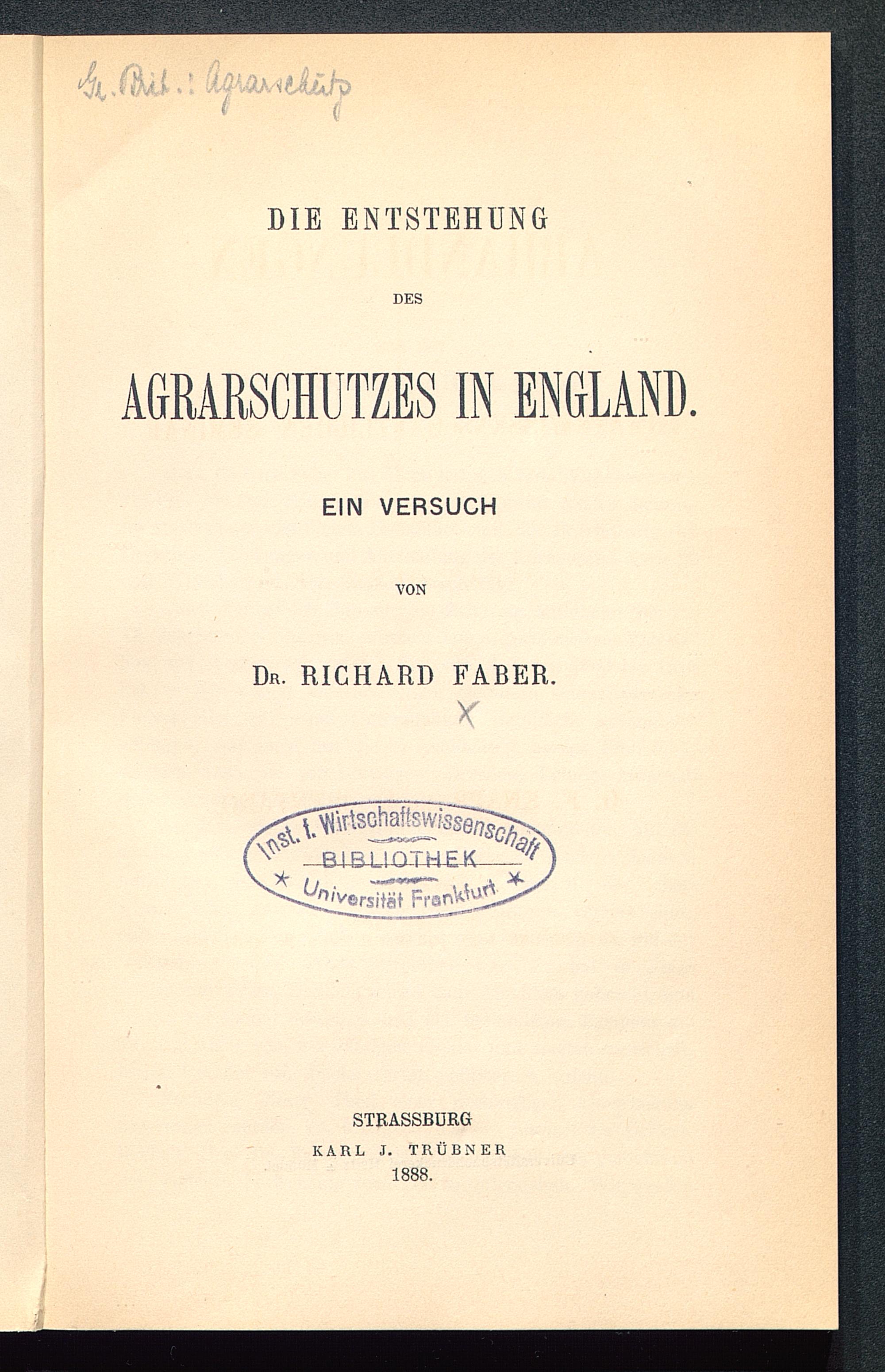 Die Entstehung des Agrarschutzes in England : ein Versuch / von Richard Faber