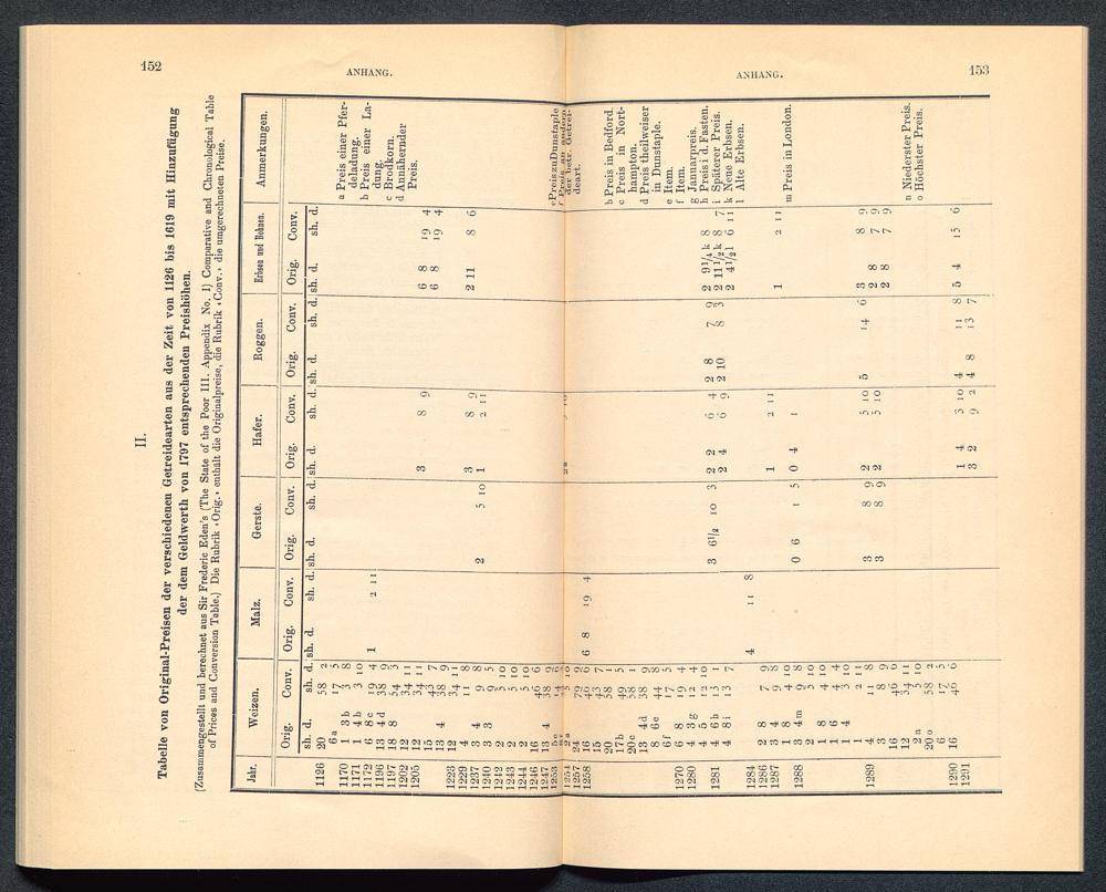 II. Tabelle von Original-Preisen der verschiedenen Getreidearten aus der Zeit von 1126 bis 1619 mit Hinzufügung der dem Geldwerth von 1797 entsprechenden Preishöhen