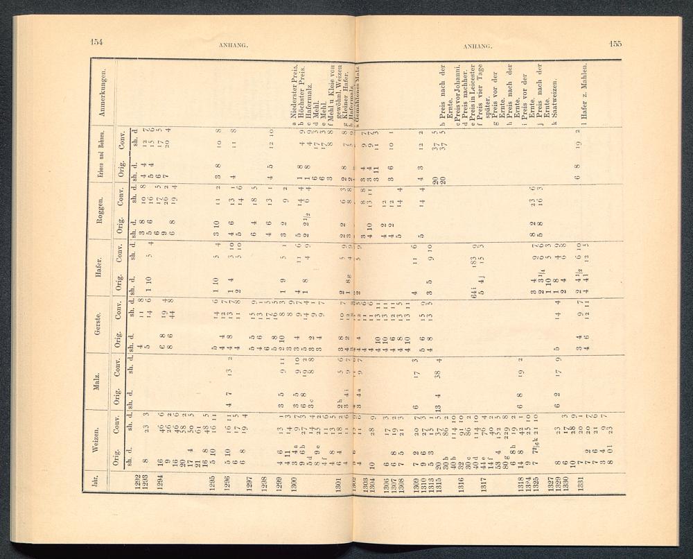 II. Tabelle von Original-Preisen der verschiedenen Getreidearten aus der Zeit von 1126 bis 1619 mit Hinzufügung der dem Geldwerth von 1797 entsprechenden Preishöhen