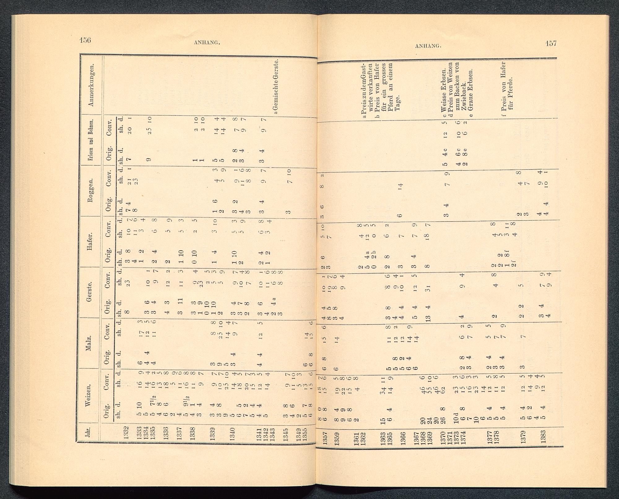 II. Tabelle von Original-Preisen der verschiedenen Getreidearten aus der Zeit von 1126 bis 1619 mit Hinzufügung der dem Geldwerth von 1797 entsprechenden Preishöhen
