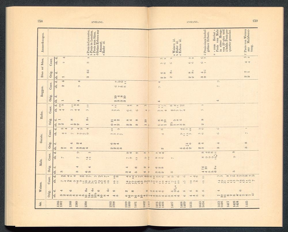 II. Tabelle von Original-Preisen der verschiedenen Getreidearten aus der Zeit von 1126 bis 1619 mit Hinzufügung der dem Geldwerth von 1797 entsprechenden Preishöhen