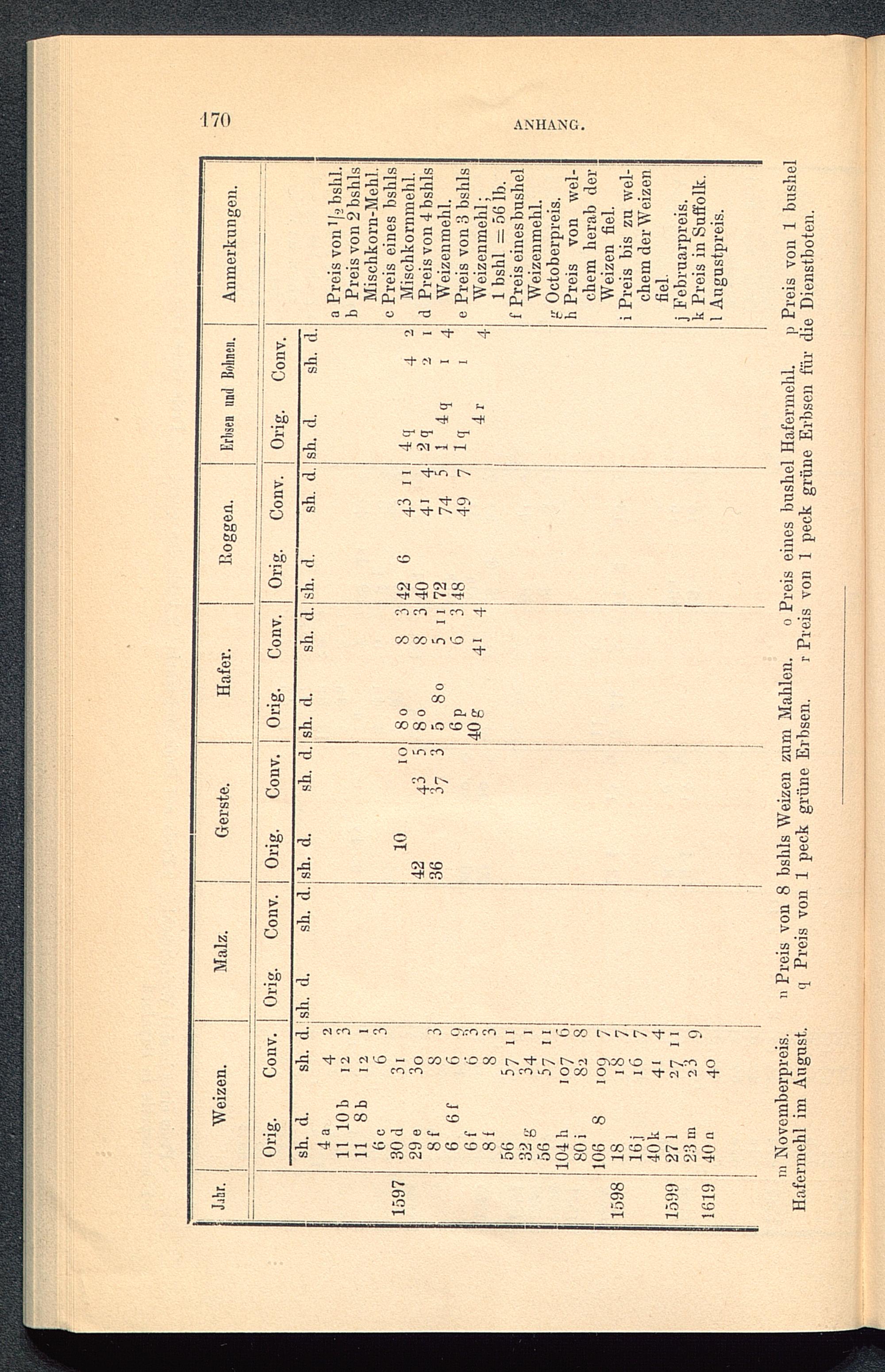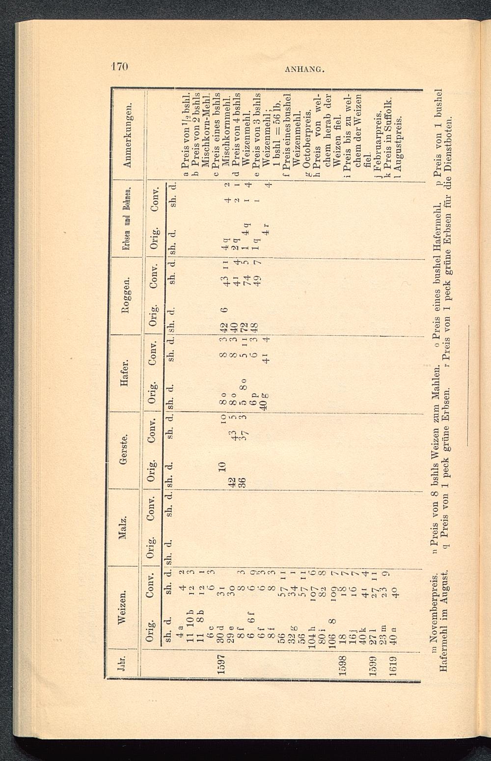 II. Tabelle von Original-Preisen der verschiedenen Getreidearten aus der Zeit von 1126 bis 1619 mit Hinzufügung der dem Geldwerth von 1797 entsprechenden Preishöhen