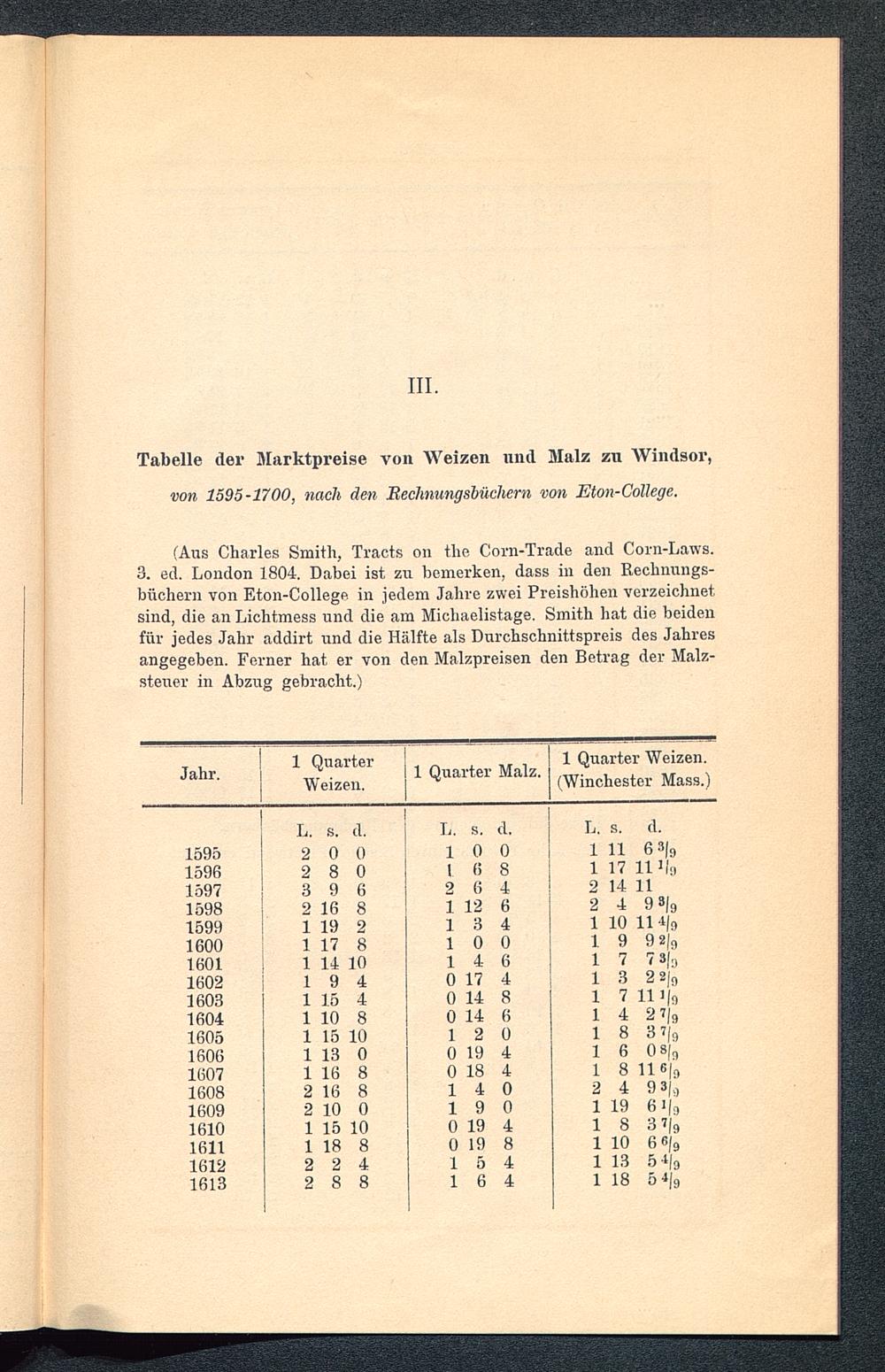 III. Tabelle der Marktpreise von Weizen und Malz zu Windsor, von 1595-1700, nach den Rechnungsbüchern von Eton-College