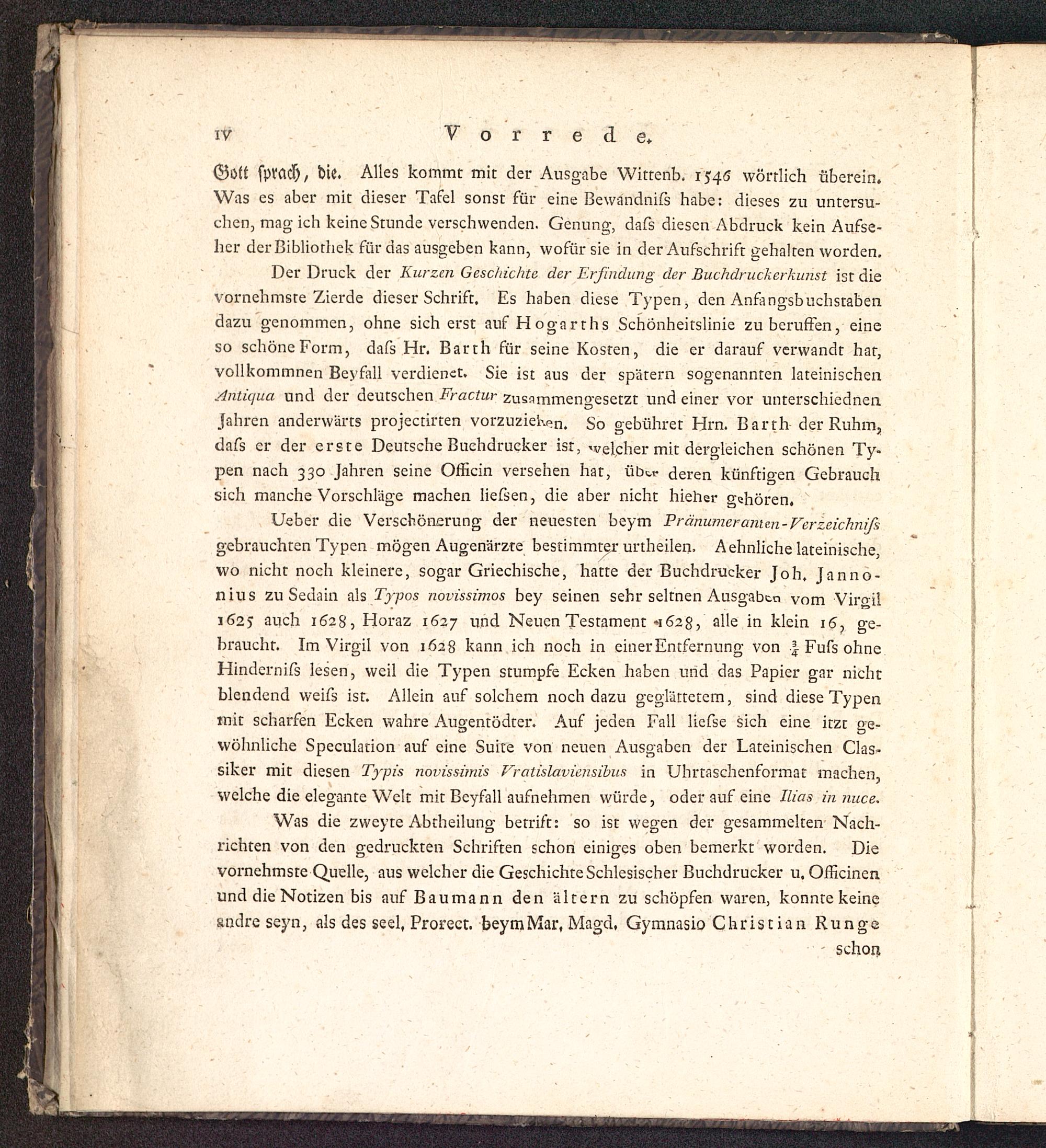 Geschichte der seit dreihundert Jahren in Breslau befindlichen Stadtbuchdruckerey als ein Beitrag zur allgemeinen Geschichte der Buchdruckerkunst : Mit 4 Bildnissen und 4 erläuternden Kupferplatten / [Johann August Barth ; Hr. Geiser ; Hr. Paritius. Johann Ephraim Scheibel [Vorr.]]