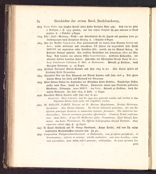 Geschichte der seit dreihundert Jahren in Breslau befindlichen Stadtbuchdruckerey als ein Beitrag zur allgemeinen Geschichte der Buchdruckerkunst : Mit 4 Bildnissen und 4 erläuternden Kupferplatten / [Johann August Barth ; Hr. Geiser ; Hr. Paritius. Johann Ephraim Scheibel [Vorr.]]