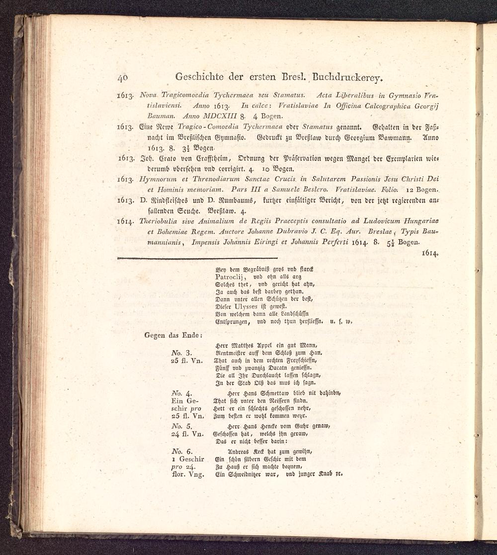 Geschichte der seit dreihundert Jahren in Breslau befindlichen Stadtbuchdruckerey als ein Beitrag zur allgemeinen Geschichte der Buchdruckerkunst : Mit 4 Bildnissen und 4 erläuternden Kupferplatten / [Johann August Barth ; Hr. Geiser ; Hr. Paritius. Johann Ephraim Scheibel [Vorr.]]