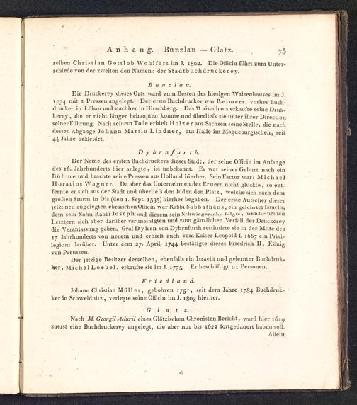 Geschichte der seit dreihundert Jahren in Breslau befindlichen Stadtbuchdruckerey als ein Beitrag zur allgemeinen Geschichte der Buchdruckerkunst : Mit 4 Bildnissen und 4 erläuternden Kupferplatten / [Johann August Barth ; Hr. Geiser ; Hr. Paritius. Johann Ephraim Scheibel [Vorr.]]