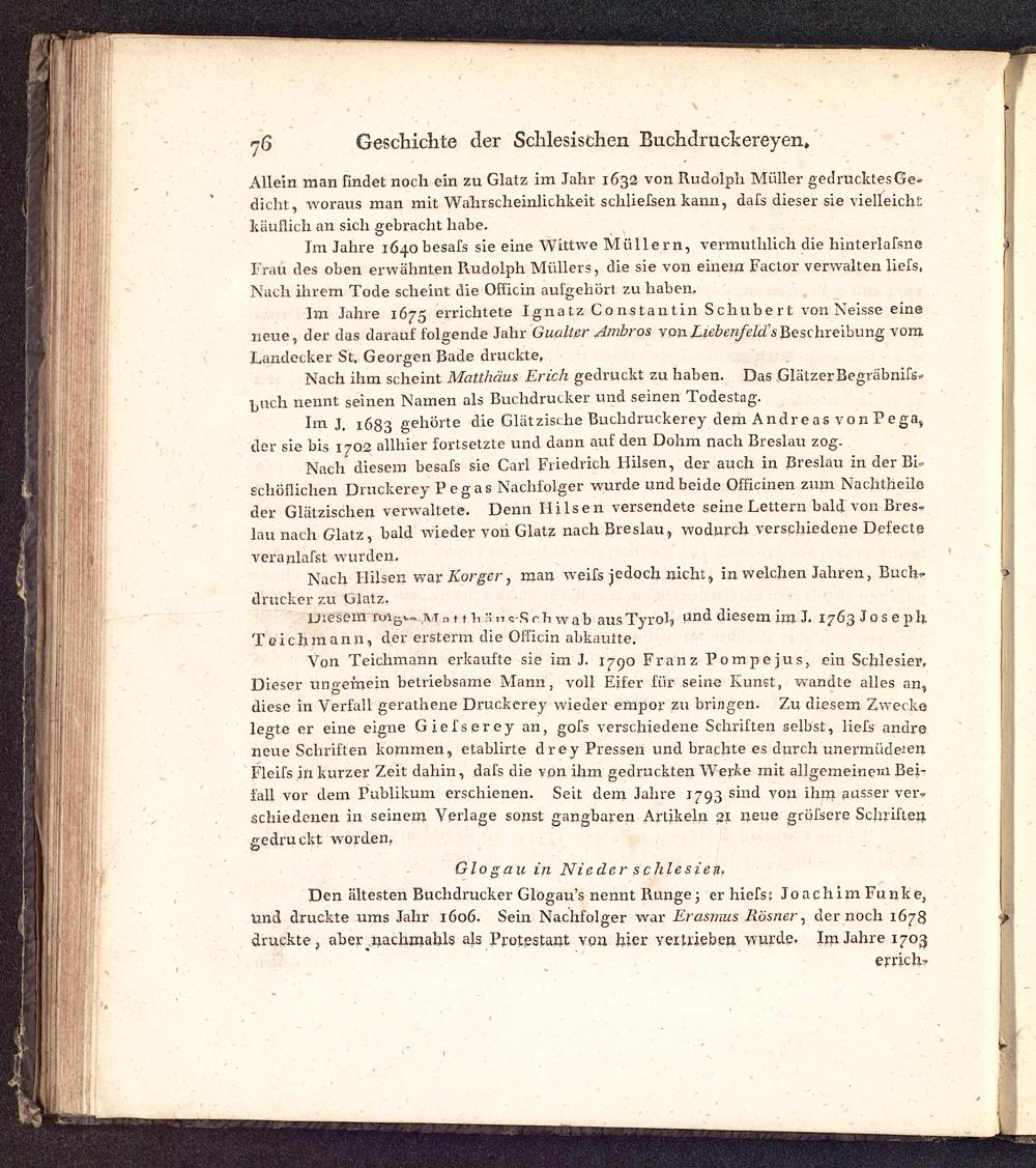 Geschichte der seit dreihundert Jahren in Breslau befindlichen Stadtbuchdruckerey als ein Beitrag zur allgemeinen Geschichte der Buchdruckerkunst : Mit 4 Bildnissen und 4 erläuternden Kupferplatten / [Johann August Barth ; Hr. Geiser ; Hr. Paritius. Johann Ephraim Scheibel [Vorr.]]