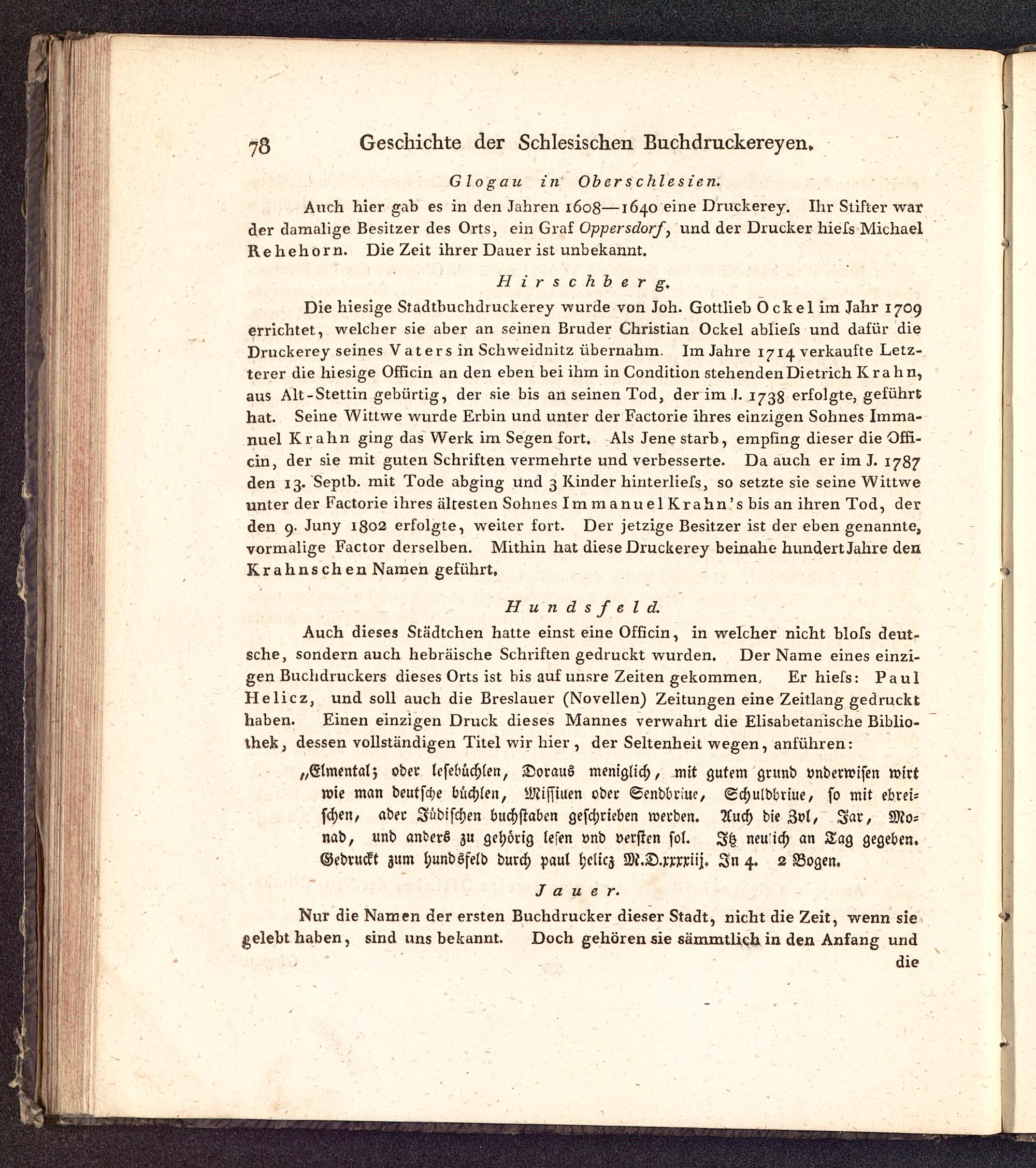 Geschichte der seit dreihundert Jahren in Breslau befindlichen Stadtbuchdruckerey als ein Beitrag zur allgemeinen Geschichte der Buchdruckerkunst : Mit 4 Bildnissen und 4 erläuternden Kupferplatten / [Johann August Barth ; Hr. Geiser ; Hr. Paritius. Johann Ephraim Scheibel [Vorr.]]