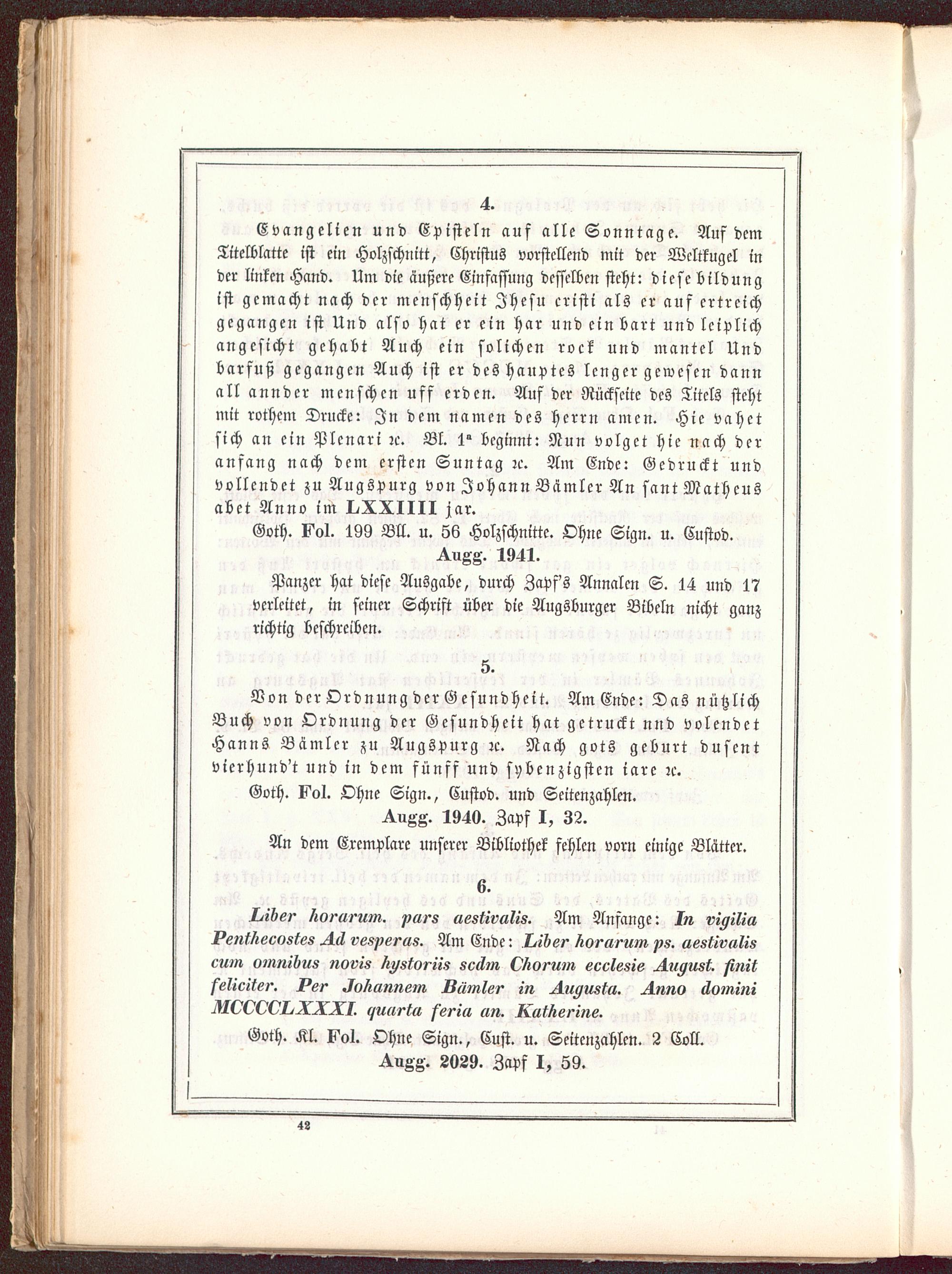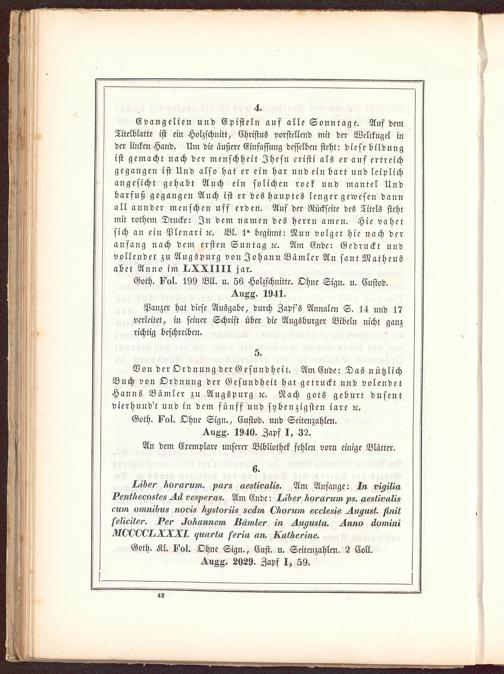 Augsburgs älteste Druckdenkmale und Formschneiderarbeiten, welche in der vereinigten königl. Kreis- und Stadtbibliothek daselbst aufbewahrt werden : nebst einer kurzen Geschichte des Bücherdruckes und Buchhandels in Augsburg ; mit 37 Abdrücken von Original-Holzschnitten aus dem 15. u. 16. Jahrhundert / von G. C. Mezger