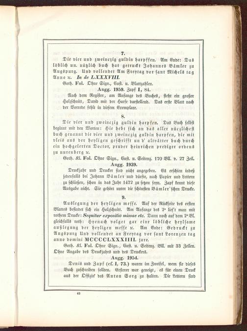 Augsburgs älteste Druckdenkmale und Formschneiderarbeiten, welche in der vereinigten königl. Kreis- und Stadtbibliothek daselbst aufbewahrt werden : nebst einer kurzen Geschichte des Bücherdruckes und Buchhandels in Augsburg ; mit 37 Abdrücken von Original-Holzschnitten aus dem 15. u. 16. Jahrhundert / von G. C. Mezger