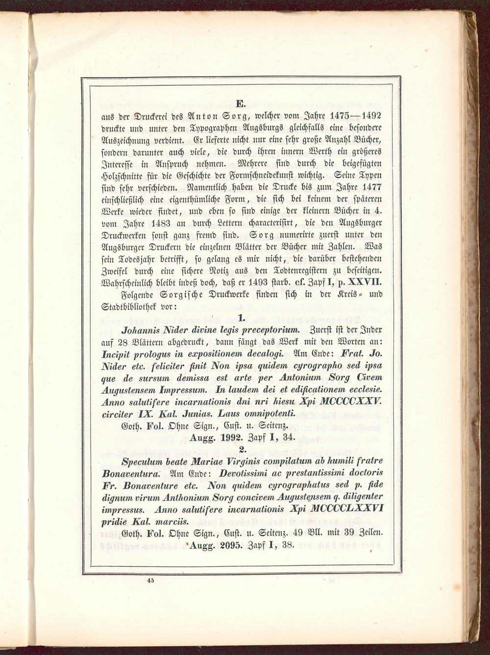 Augsburgs älteste Druckdenkmale und Formschneiderarbeiten, welche in der vereinigten königl. Kreis- und Stadtbibliothek daselbst aufbewahrt werden : nebst einer kurzen Geschichte des Bücherdruckes und Buchhandels in Augsburg ; mit 37 Abdrücken von Original-Holzschnitten aus dem 15. u. 16. Jahrhundert / von G. C. Mezger