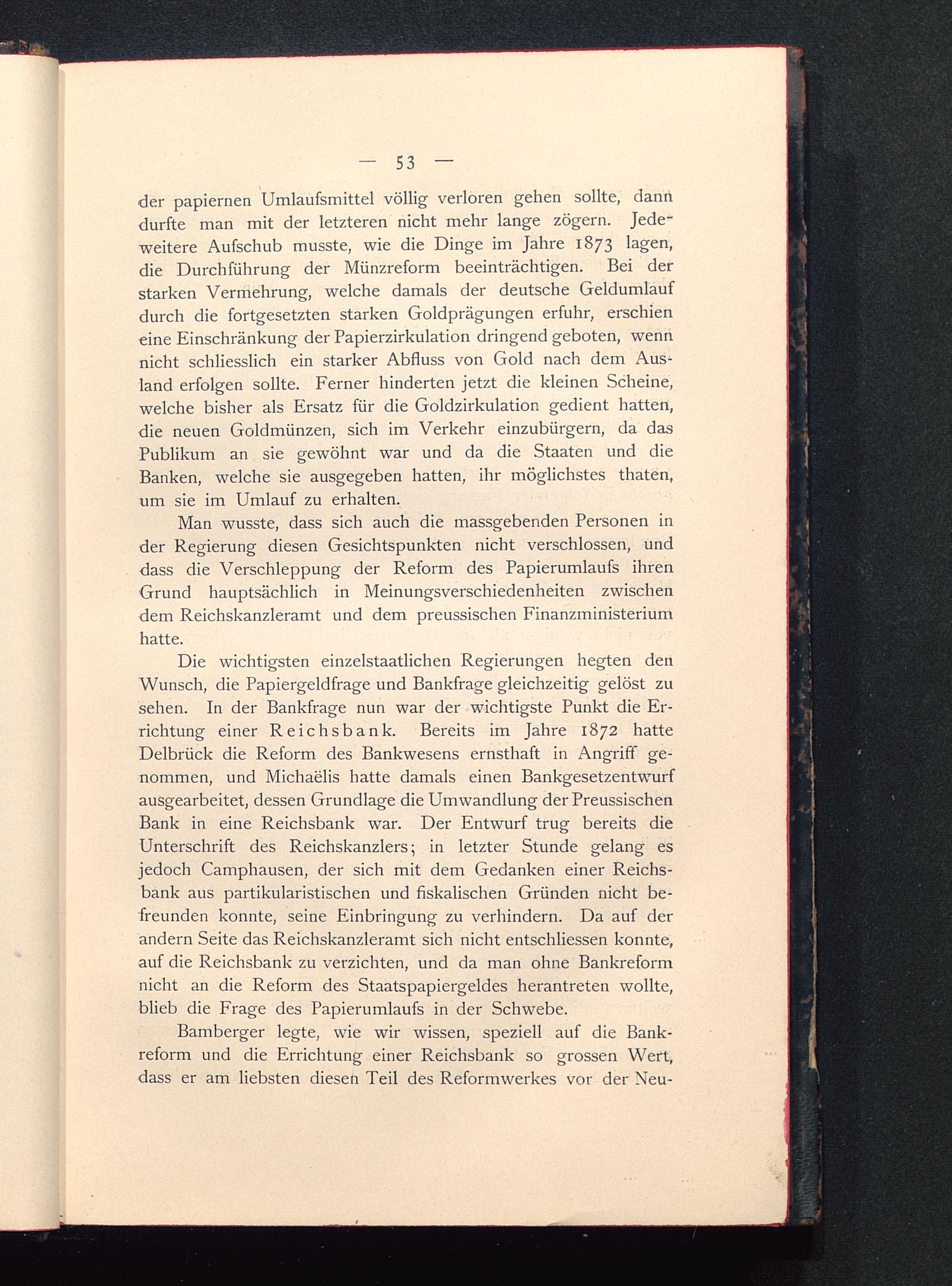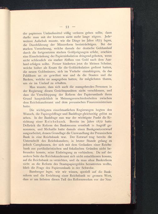 Bamberger legte, wie wir wissen, speziell auf die Bank-reform und die Errichtung einer Reichsbank so grossen Wert,dass er am liebsten diesen Teil des Reformwerkes vor der Neu-