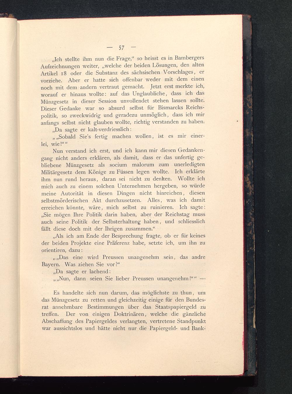 „Ich stellte ihm nun die Frage," so heisst es in BambergersAufzeichnungen weiter, „welche der beiden Lösungen, den altenArtikel 18 oder die Substanz des sächsischen Vorschlages, ervorziehe. Aber er hatte sich offenbar weder mit dem einennoch mit dem andern vertraut gemacht. Jetzt erst merkte ich,worauf er hinaus wollte: auf das Unglaubliche, dass ich dasMünzgesetz in dieser Session unvollendet stehen lassen sollte.Dieser Gedanke war so absurd selbst für Bismarcks Reichs-politik, so zweckwidrig und geradezu unmöglich, dass ich miranfangs selbst nicht glauben wollte, richtig verstanden zu haben.
