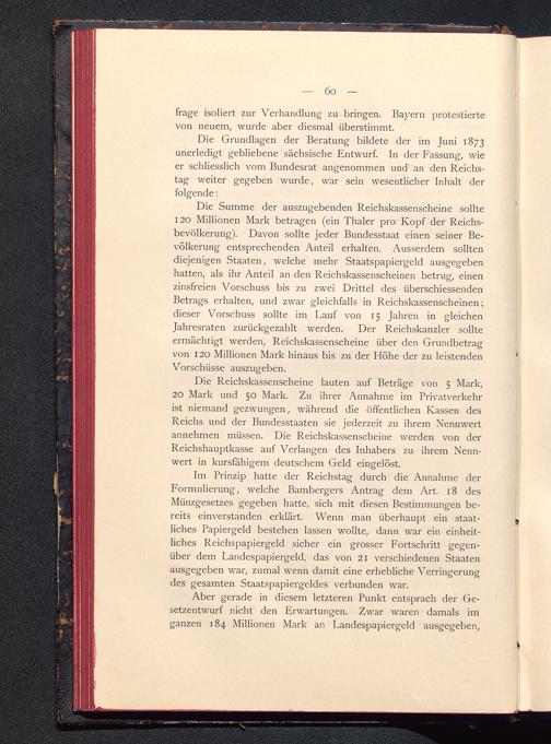 Im Prinzip hatte der Reichstag durch die Annahme derFormulierung, welche Bambergers Antrag dem Art. 18 desMünzgesetzes gegeben hatte, sich mit diesen Bestimmungen be-reits einverstanden erklärt. Wenn man überhaupt ein staat-liches Papiergeld bestehen lassen wollte, dann war ein einheit-liches Reichspapiergeld sicher ein grosser Fortschritt gegen-über dem Landespapiergeld, das von 21 verschiedenen Staatenausgegeben war, zumal wenn damit eine erhebliche Verringerungdes gesamten Staatspapiergeldes verbunden war.