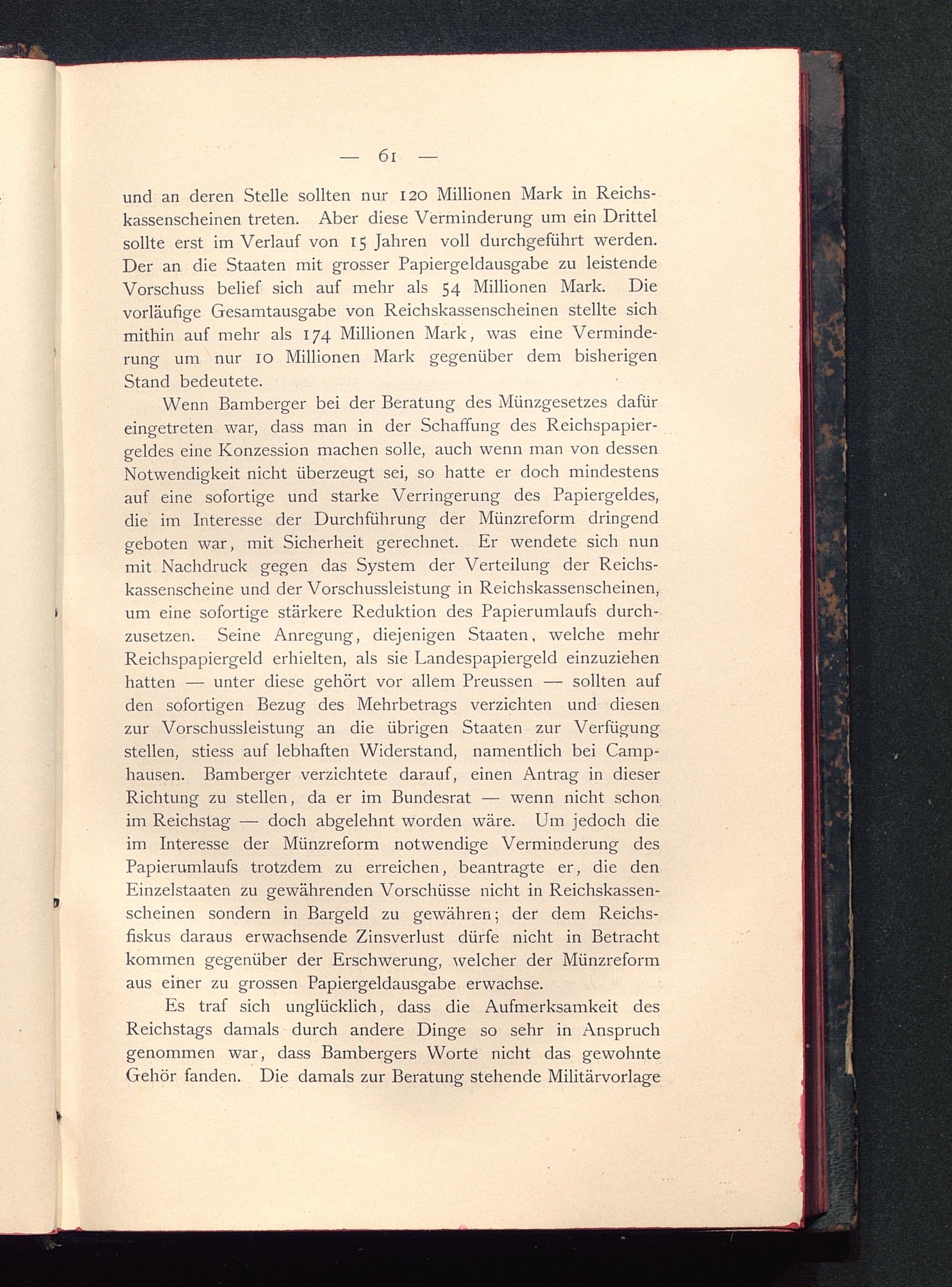 Es traf sich unglücklich, dass die Aufmerksamkeit desReichstags damals durch andere Dinge so sehr in Anspruchgenommen war, dass Bambergers Worte nicht das gewohnteGehör fanden. Die damals zur Beratung stehende Militärvorlage