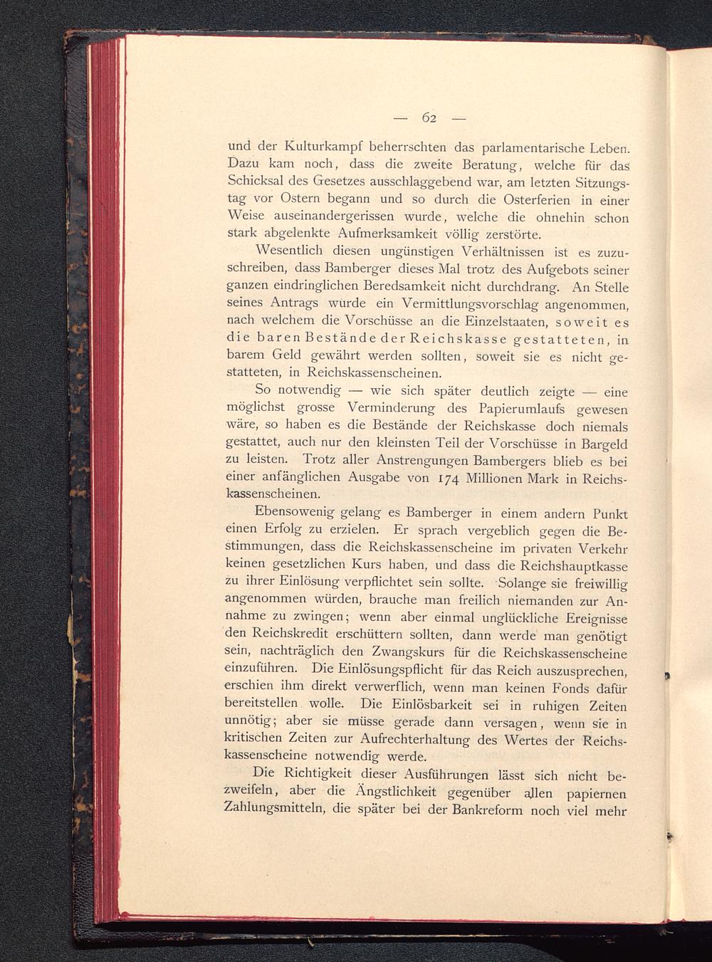 So notwendig — wie sich später deutlich zeigte — einemöglichst grosse Verminderung des Papierumlaufs gewesenwäre, so haben es die Bestände der Reichskasse doch niemalsgestattet, auch nur den kleinsten Teil der Vorschüsse in Bargeldzu leisten. Trotz aller Anstrengungen Bambergers blieb es beieiner anfänglichen Ausgabe von 174 Millionen Mark in Reichs-kassenscheinen.