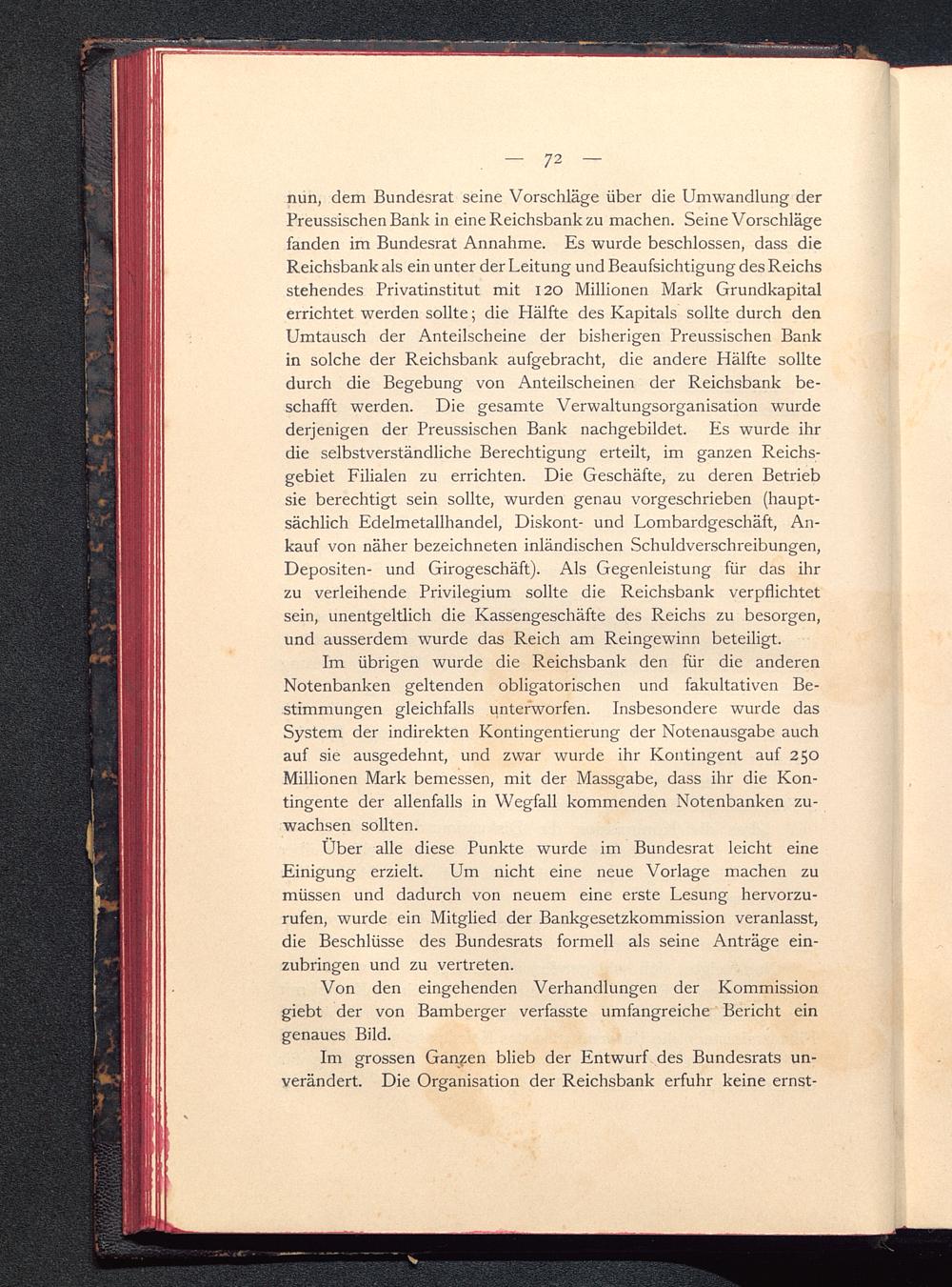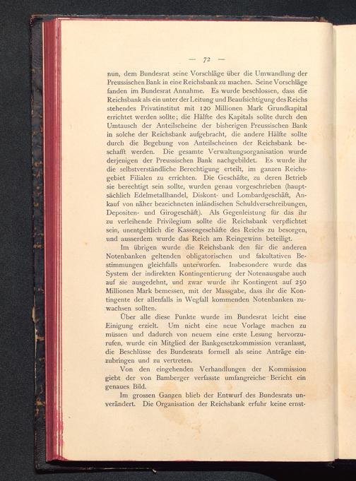 Im grossen Ganzen blieb der Entwurf des Bundesrats un-verändert. Die Organisation der Reichsbank erfuhr keine ernst-
