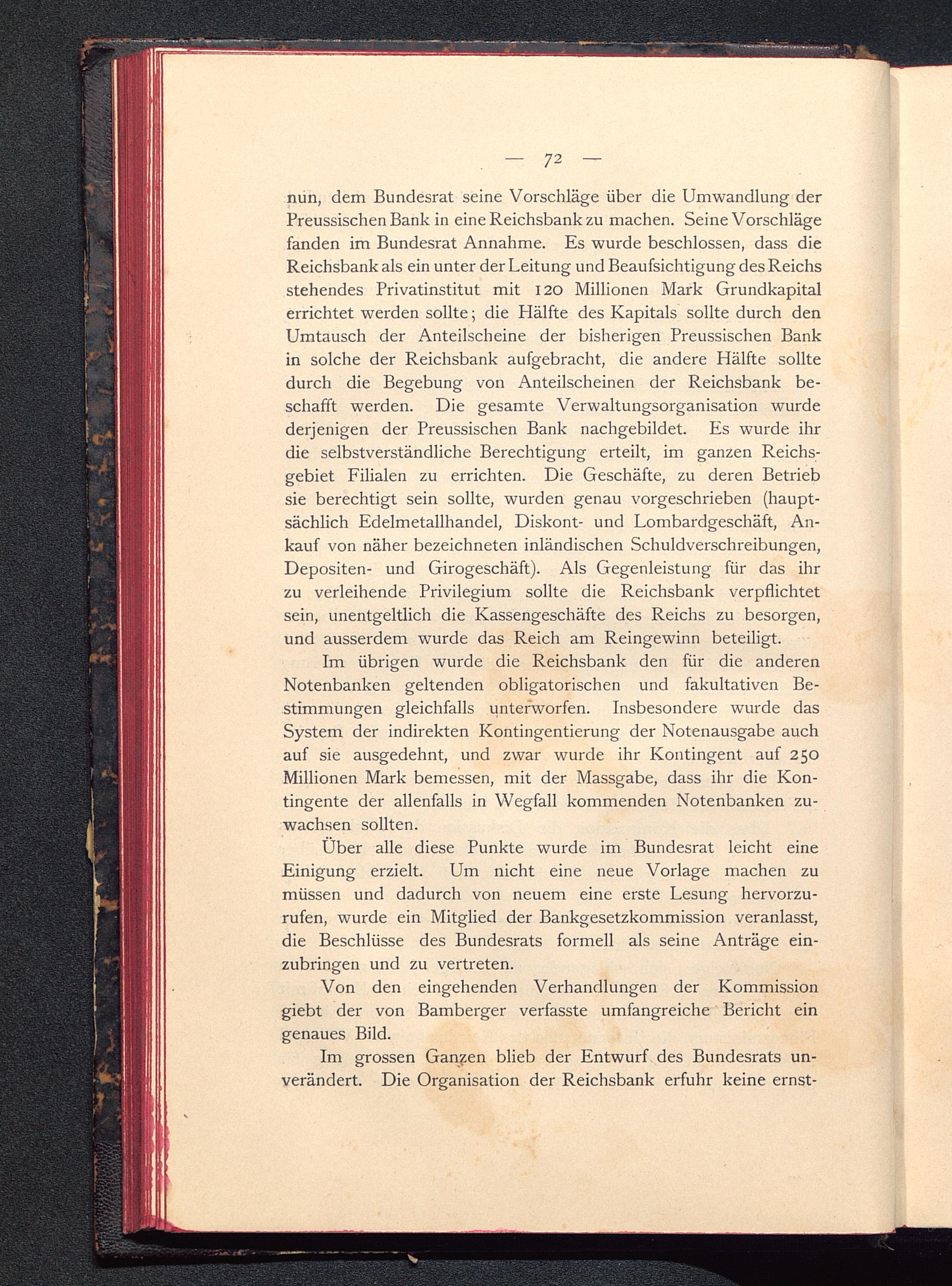 nun, dem Bundesrat seine Vorschläge über die Umwandlung derPreussischen Bank in eine Reichsbank zu machen. Seine Vorschlägefanden im Bundesrat Annahme. Es wurde beschlossen, dass dieReichsbank als ein unter der Leitung und Beaufsichtigung des Reichsstehendes Privatinstitut mit 120 Millionen Mark Grundkapitalerrichtet werden sollte; die Hälfte des Kapitals sollte durch denUmtausch der Anteilscheine der bisherigen Preussischen Bank in solche der Reichsbank aufgebracht, die andere Hälfte solltedurch die Begebung von Anteilscheinen der Reichsbank be-schafft werden. Die gesamte Verwaltungsorganisation wurdederjenigen der Preussischen Bank nachgebildet. Es wurde ihrdie selbstverständliche Berechtigung erteilt, im ganzen Reichs-gebiet Filialen zu errichten. Die Geschäfte, zu deren Betriebsie berechtigt sein sollte, wurden genau vorgeschrieben (haupt-sächlich Edelmetallhandel, Diskont- und Lombardgeschäft, An-kauf von näher bezeichneten inländischen Schuldverschreibungen,Depositen- und Girogeschäft). Als Gegenleistung für das ihrzu verleihende Privilegium sollte die Reichsbank verpflichtetsein, unentgeltlich die Kassengeschäfte des Reichs zu besorgen,und ausserdem wurde das Reich am Reingewinn beteiligt.