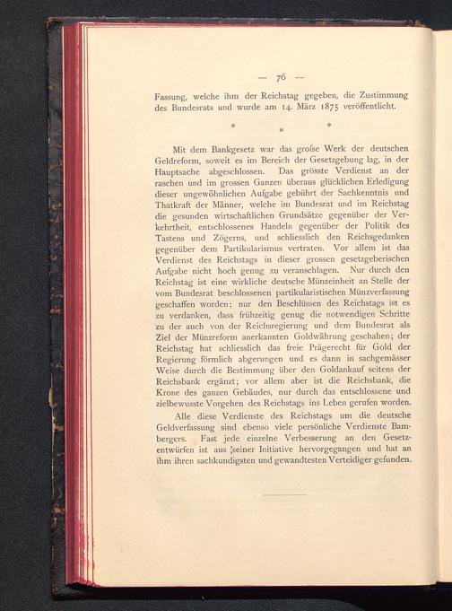 Alle diese Verdienste des Reichstags um die deutscheGeldverfassung sind ebenso viele persönliche Verdienste Bam-bergers. Fast jede einzelne Verbesserung an den Gesetz-entwürfen ist aus [seiner Initiative hervorgegangen und hat anihm ihren sachkundigsten und gewandtesten Verteidiger gefunden.