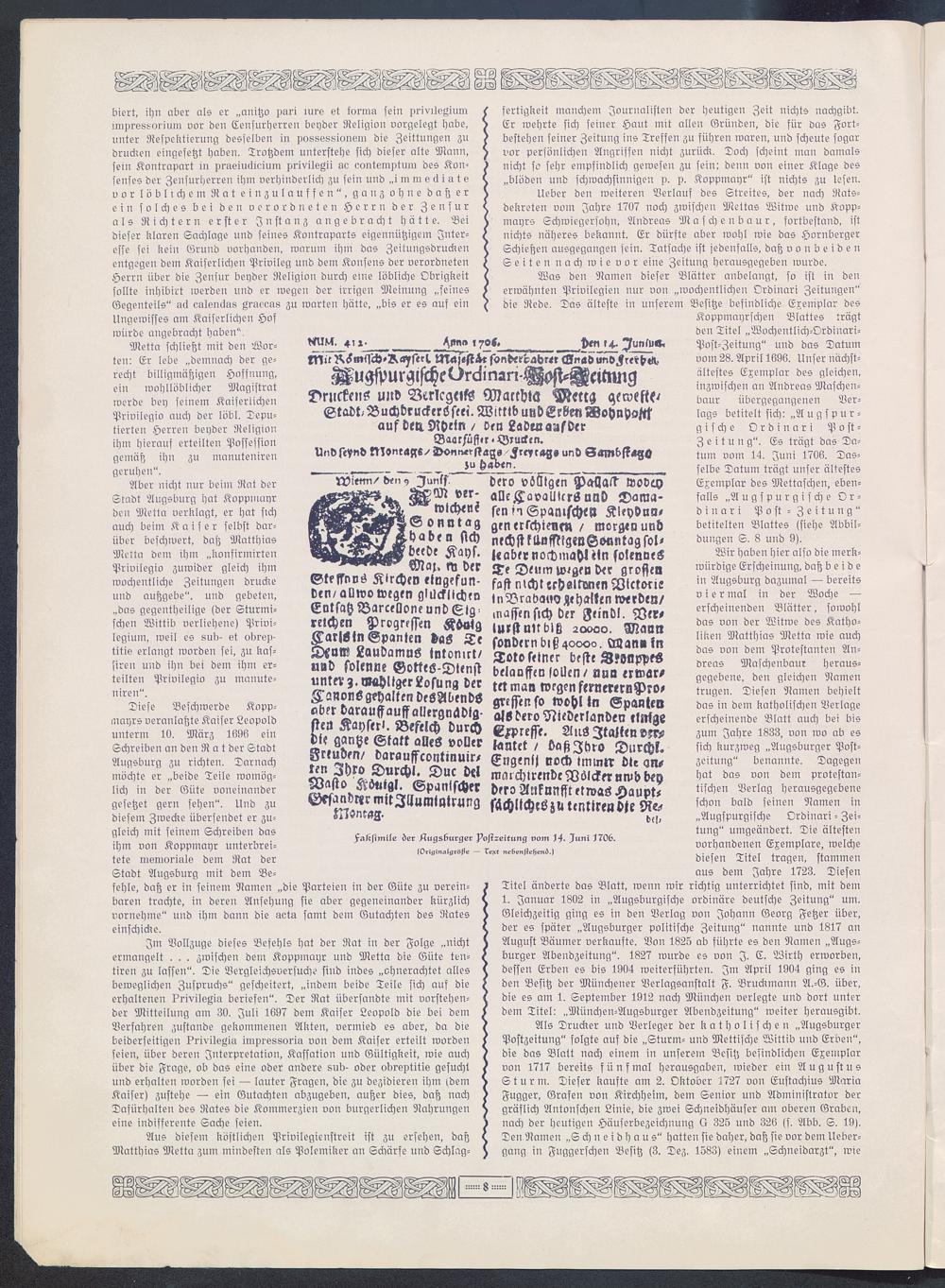 Koppmayrschen Blattes trägtden Titel „Wochentlich-Ordinari-Post-Zeitung" und das Datumvom 28. April 1696. Unser nüchst-ältestes Exemplar des gleichen,inzwischen an Andreas Maschen-baur übergegangenen Ver-lags betitelt sich: „A ugspur -gische Ordinari Post-Zeit u n g". Es trägt das Da-tum vom 14. Juni 1706. Das-selbe Datum trägt unser ältestesExemplar des Mettaschen, eben-falls „A u g s p u r g i s ch e Or-dinari Post-Zeitung"betitelten Blattes (siehe Abbil-dungen S. 8 und 9).