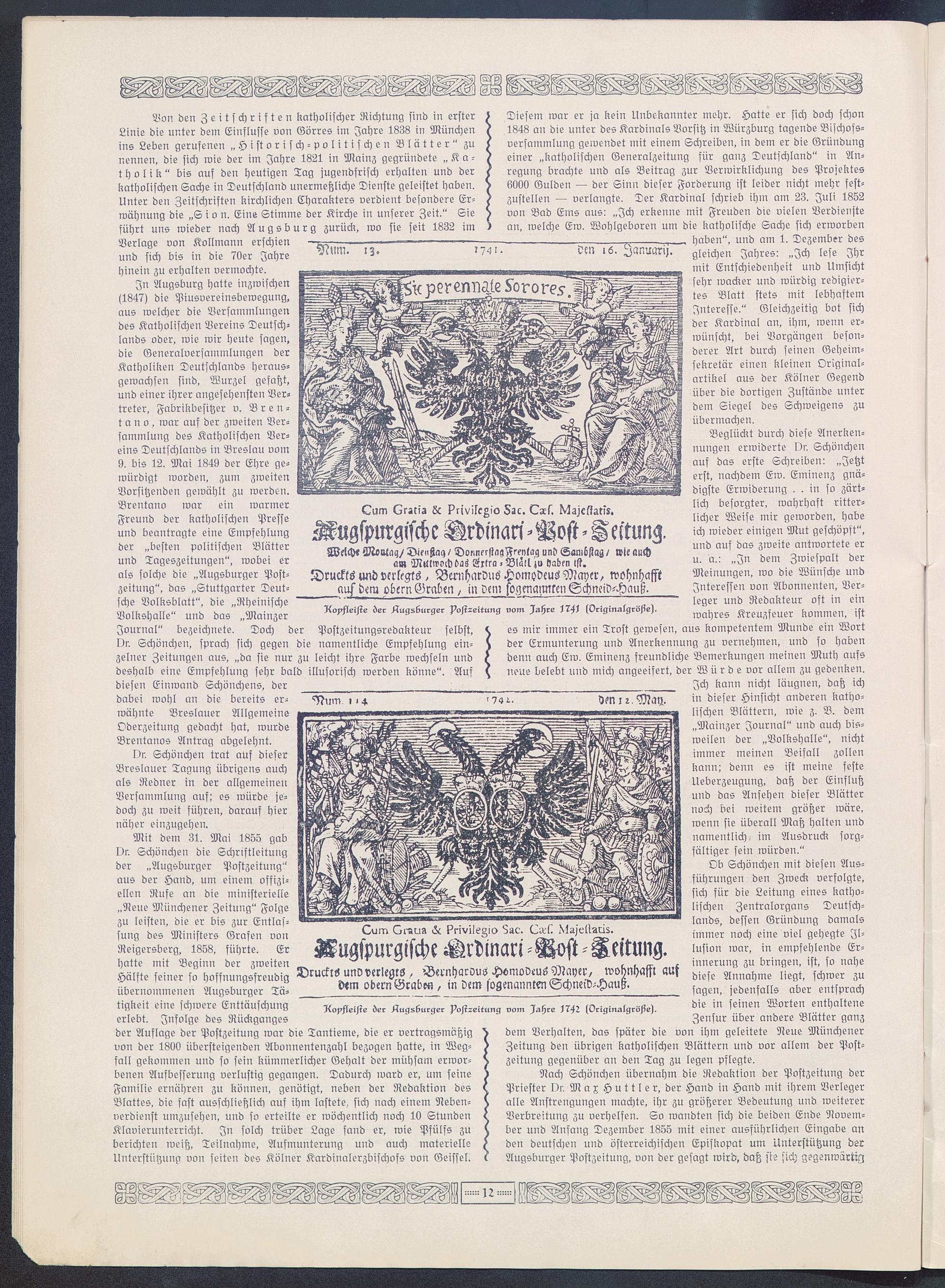 Ob Schönchen mit diesen Aus-führungen den Zweck verfolgte,sich für die Leitung eines katho-lischen Zentralorgans Deutsch-lands , dessen Gründung damalsimmer noch eine viel gehegte Il-lusion war, in empfehlende Er-innerung zu bringen, ist, so nahediese Annahme liegt, schwer zusagen, jedenfalls aber entsprachdie in seinen Worten enthalteneZensur über andere Blätter ganzdem Verhalten, das später die von ihm geleitete Neue Münchener Zeitung den übrigen katholischen Blättern und vor allem der Post-zeitung gegenüber an den Tag zu legen pflegte.