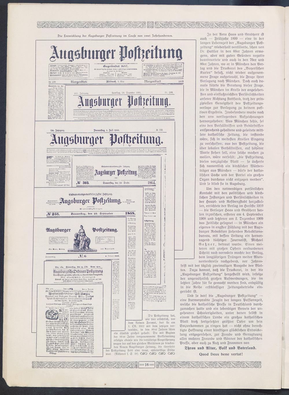 Und so darf die „Augsburger Postzeitung" —eine sturmerprobte Zeugin der langen Passionszeit,welche die katholische Presse in Deutschland durch-zumachen hatte und ein lebendiger Beweis der un-geheuren Schwierigkeiten, unter denen selbst ineinem katholischen Lande ein großes katholischesBlatt trotz fortgesetzter größter Opfer um seinEmporkommen zu ringen hat — nicht ohne berech-tigte Hoffnung einer künftigen glücklichen Entwicke-lung entgegensehen, zur Freude und Genugtuungaller wahren Freunde und Gönner der katholischenPresse, aber auch zu Nutz und Frommen vonThron und Altar, Volk unk» Vaterland,tzuoä Veu8 bene vertat!
