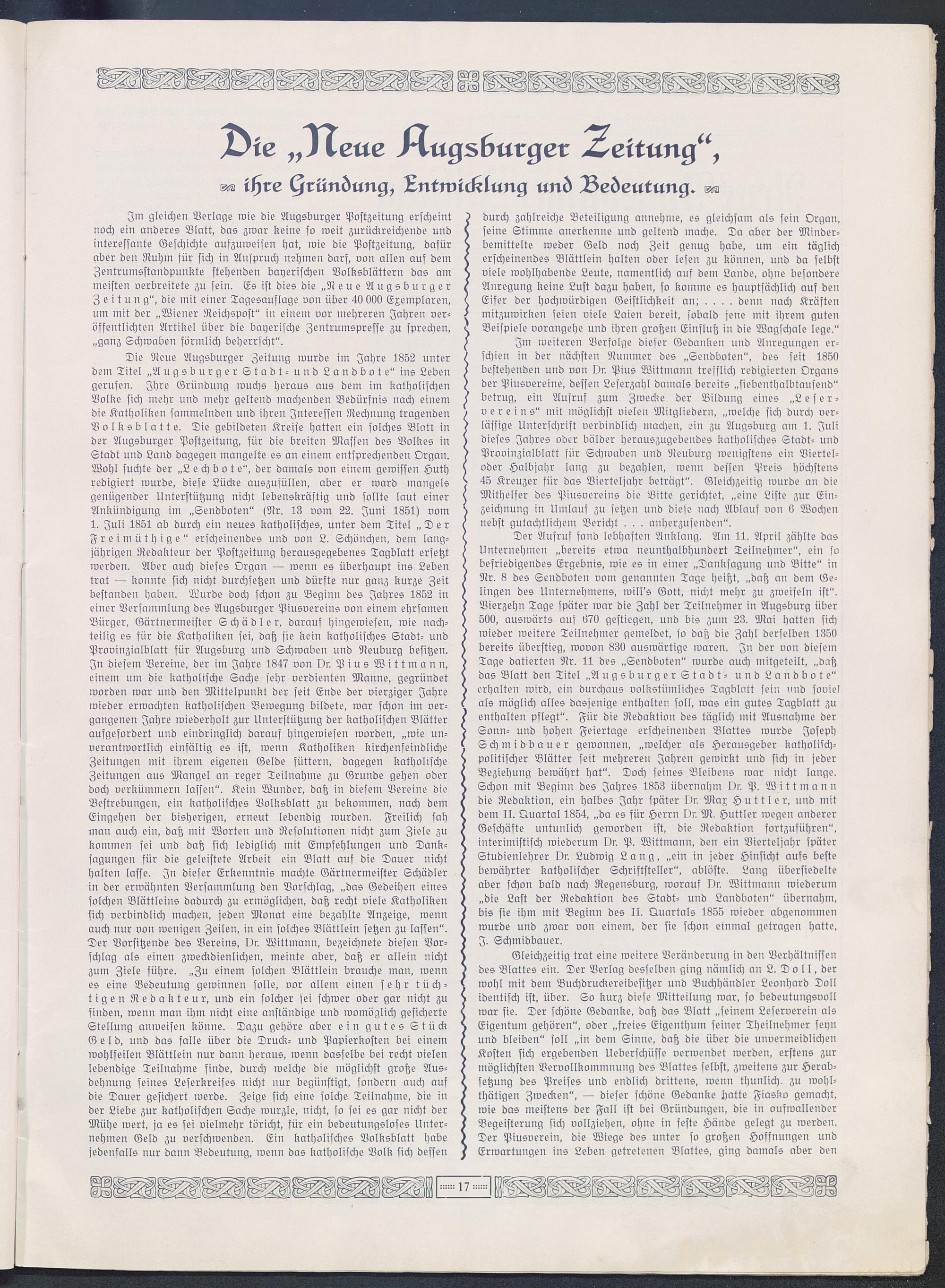 > bestehenden und von Or. Pius Wittmann trefflich redigierten Organs) der Piusvereine, dessen Leserzahl damals bereits „siebenthalbtausend"