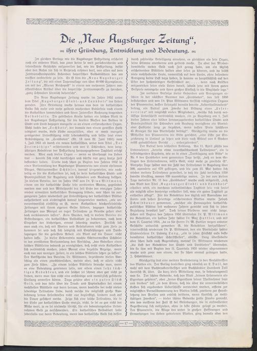 Iin gleichen Verlage wie die Augsburger Postzeitung erscheintnoch ein anderes Blatt, das zwar keine so weit zurückreichende undinteressante Geschichte auszuweisen hat, wie die Postzeitung, dafüraber den Ruhm für sich in Anspruch nehmen darf, von allen auf demZentrumsstandpunkte stehenden bayerischen Volksblättern das ammeisten verbreitete zu sein. Es ist dies die „Neue AugsburgerZeitun g", die mit einer Tagesauflage von über 40 000 Exemplaren,um mit der „Wiener Reichspost" in einem vor mehreren Jahren ver-öffentlichten Artikel über die bayerische Zentrumspresse zu sprechen,„ganz Schwaben förmlich beherrscht".