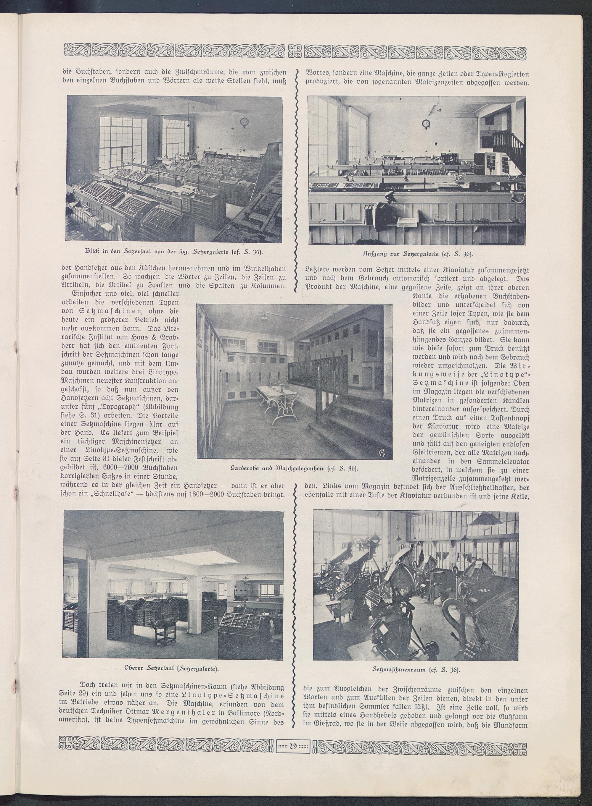 Doch treten wir in den Setzmaschinen-Raum (siehe AbbildungSeite 29) ein und sehen uns so eine Linotype-Setzmaschine im Betriebe etwas näher an. Die Maschine, erfunden von demdeutschen Techniker Ottmar Mergenthaler in Baltimore (Nord-amerika), ist keine Typensetzmaschine im gewöhnlichen Sinne des