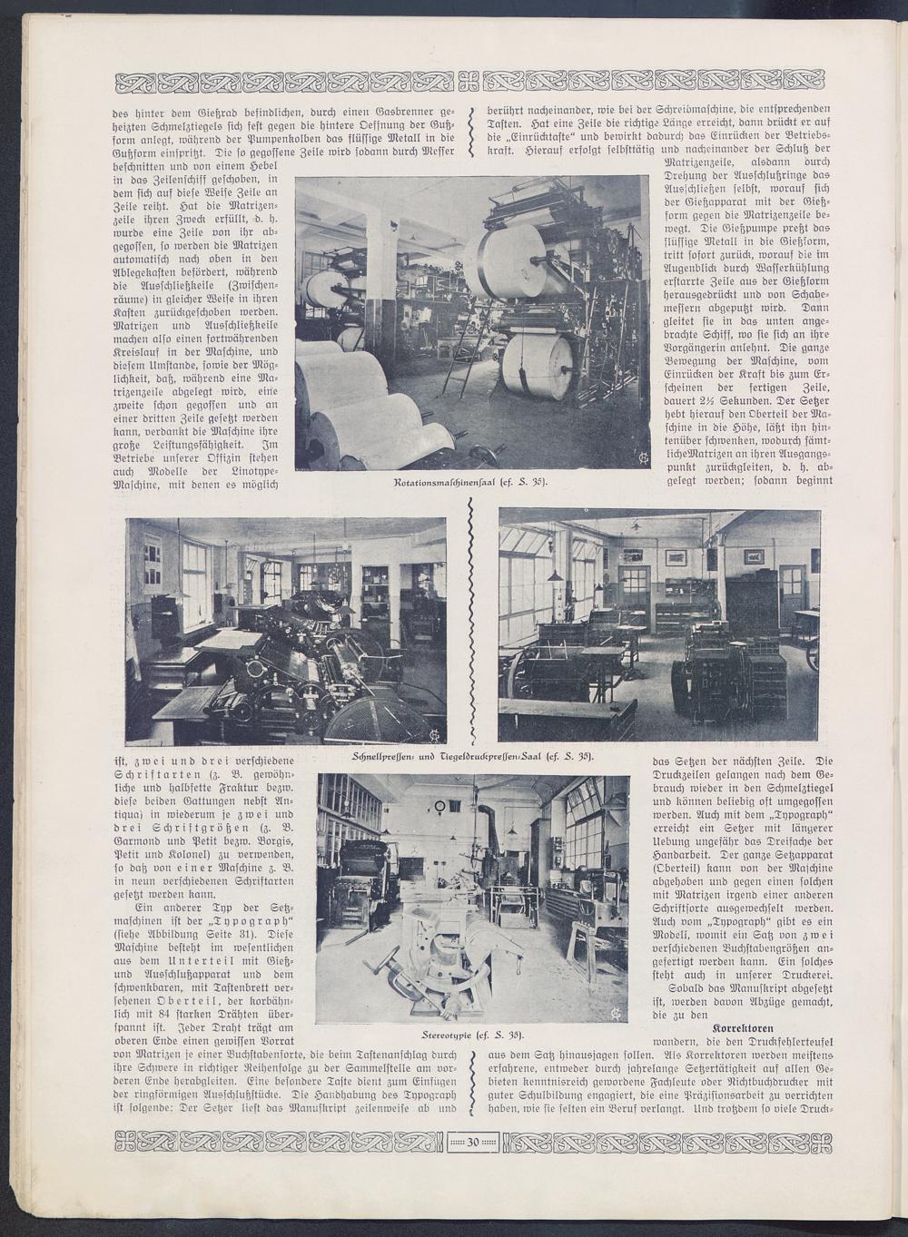 (siehe Abbildung Seite 31). DieseMaschine besteht im wesentlichenaus dem Unterteil mit Gieß-und Ausschlußapparat und demschwenkbaren, mit Tastenbrett ver-sehenen Oberteil, der korbähn-lich mit 84 starken Drähten über-spannt ist. Jeder Draht trägt amoberen Ende einen gewissen Vorratvon Matrizen je einer Buchstabensorte, die beim Tastenanschlag durchihre Schwere in richtiger Reihenfolge zu der Sammelstelle am vor-deren Ende Herabgleiten. Eine besondere Taste dient zum Einfügender ringförmigen Ausschlußstücke. Die Handhabung des Typographist folgende: Der Setzer liest das Manuskript zeilenweise ab und