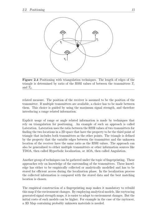 2.2. Positioning 15Figure 2.4 Positioning with triangulation techniques. The length of edges of thetriangle is determined by ratio of the RSSI values of between the transmitters T1and T2.related measure. The position of the receiver is assumed to be the position of thetransmitter. If multiple transmitters are available, a choice has to be made betweenthem. This choice is guided by using the maximum signal strength, and thereforeintroducing a range related information.Explicit usage of range or angle related information is made by techniques thatrely on triangulation for positioning. An example of such an approach is calledLateration . Lateration uses the ratio between the RSSI values of two transmitters forfinding the two locations in a 2D space that have the property to be the third point oftriangle that includes both transmitters as the other points. The triangle is definedby the property that the variable edges between the transmitter and the unknownlocation of the receiver have the same ratio as the RSSI values. The approach canalso be generalized to either multiple transmitters or other information sources likeTDOA, then called Hyperbolic localization, or AOA, then called Angulation.Another group of techniques can be gathered under the topic of fingerprinting. Theseapproaches rely on knowledge of the surrounding of the transmitters. These knowl-edge has either to be empirically collected or analytically modelled and has to bestored for efficient access during the localization phase. In the localization processthe collected information is compared with the stored data and the best matchinglocation is chosen.The empirical construction of a fingerprinting map makes it mandatory to rebuildthis map if the environment changes. By employing analytical models, like raytracinggenerated signal strength maps, it is easier to adapt to environment changes. But theinitial costs of such models can be higher. For example in the case of the raytracer,a 3D Map containing probably unknown materials is needed.