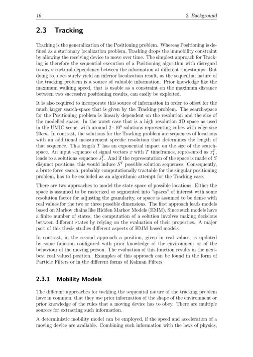 16 2. Background2.3 TrackingTracking is the generalization of the Positioning problem. Whereas Positioning is de-fined as a stationary localization problem, Tracking drops the immobility constraintby allowing the receiving device to move over time. The simplest approach for Track-ing is therefore the sequential execution of a Positioning algorithm with disregardto any structural dependency between the information at different timestamps. Butdoing so, does surely yield an inferior localization result, as the sequential nature ofthe tracking problem is a source of valuable information. Prior knowledge like themaximum walking speed, that is usable as a constraint on the maximum distancebetween two successive positioning results, can easily be exploited.It is also required to incorporate this source of information in order to offset for themuch larger search-space that is given by the Tracking problem. The search-spacefor the Positioning problem is linearly dependent on the resolution and the size ofthe modelled space. In the worst case that is a high resolution 3D space as usedin the UMIC scene, with around 2 · 106solutions representing cubes with edge size20 cm. In contrast, the solutions for the Tracking problem are sequences of locationswith an additional measurement specific resolution that determines the length ofthat sequence. This length T has an exponential impact on the size of the search-space. An input sequence of signal vectors x with T timeframes, represented as xT1,leads to a solutions sequence sT1. And if the representation of the space is made of Sdisjunct positions, this would induce STpossible solution sequences. Consequently,a brute force search, probably computationally tractable for the singular positioningproblem, has to be excluded as an algorithmic attempt for the Tracking case.There are two approaches to model the state space of possible locations. Either thespace is assumed to be rasterized or segmented into"spaces" of interest with someresolution factor for adjusting the granularity, or space is assumed to be dense withreal values for the two or three possible dimensions. The first approach leads modelsbased on Markov chains like Hidden Markov Models(HMM ). Since such models havea finite number of states, the computation of a solution involves making decisionsbetween different states by relying on the evaluation of their properties. A majorpart of this thesis studies different aspects of HMM based models.In contrast, in the second approach a position, given in real values, is updatedby some function configured with prior knowledge of the environment or of thebehaviour of the moving person. The evaluation of this function results in the next-best real valued position. Examples of this approach can be found in the form ofParticle Filters or in the different forms of Kalman Filters .2.3.1 Mobility ModelsThe different approaches for tackling the sequential nature of the tracking problemhave in common, that they use prior information of the shape of the environment orprior knowledge of the rules that a moving device has to obey. There are multiplesources for extracting such information.A deterministic mobility model can be employed, if the speed and acceleration of amoving device are available. Combining such information with the laws of physics,