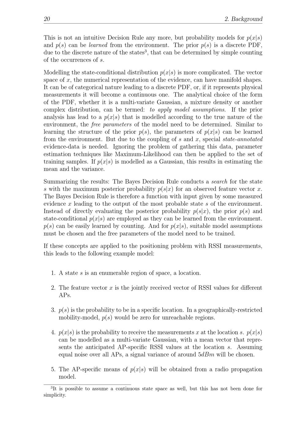 20 2. BackgroundThis is not an intuitive Decision Rule any more, but probability models for p( x| s)and p( s) can be learned from the environment. The prior p( s) is a discrete PDF,due to the discrete nature of the states3, that can be determined by simple countingof the occurrences of s.Modelling the state-conditional distribution p( x| s) is more complicated. The vectorspace of x, the numerical representation of the evidence, can have manifold shapes.It can be of categorical nature leading to a discrete PDF, or, if it represents physicalmeasurements it will become a continuous one. The analytical choice of the formof the PDF, whether it is a multi-variate Gaussian, a mixture density or anothercomplex distribution, can be termed: to apply model assumptions. If the prioranalysis has lead to a p( x| s) that is modelled according to the true nature of theenvironment, the free parameters of the model need to be determined. Similar tolearning the structure of the prior p( s), the parameters of p( x| s) can be learnedfrom the environment. But due to the coupling of s and x, special state-annotatedevidence-data is needed. Ignoring the problem of gathering this data, parameterestimation techniques like Maximum-Likelihood can then be applied to the set oftraining samples. If p( x| s) is modelled as a Gaussian, this results in estimating themean and the variance.Summarizing the results: The Bayes Decision Rule conducts a search for the states with the maximum posterior probability p( s| x) for an observed feature vector x.The Bayes Decision Rule is therefore a function with input given by some measuredevidence x leading to the output of the most probable state s of the environment.Instead of directly evaluating the posterior probability p( s| x), the prior p( s) andstate-conditional p( x| s) are employed as they can be learned from the environment.p( s) can be easily learned by counting. And for p( x| s), suitable model assumptionsmust be chosen and the free parameters of the model need to be trained.If these concepts are applied to the positioning problem with RSSI measurements,this leads to the following example model:1. A state s is an enumerable region of space, a location.2. The feature vector x is the jointly received vector of RSSI values for differentAPs.3. p( s) is the probability to be in a specific location. In a geographically-restrictedmobility-model, p( s) would be zero for unreachable regions.4. p( x| s) is the probability to receive the measurements x at the location s. p( x| s)can be modelled as a multi-variate Gaussian, with a mean vector that repre-sents the anticipated AP -specific RSSI values at the location s. Assumingequal noise over all APs, a signal variance of around 5 dBm will be chosen.5. The AP -specific means of p( x| s) will be obtained from a radio propagationmodel.3It is possible to assume a continuous state space as well, but this has not been done forsimplicity.