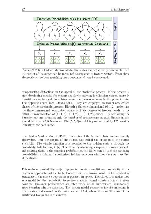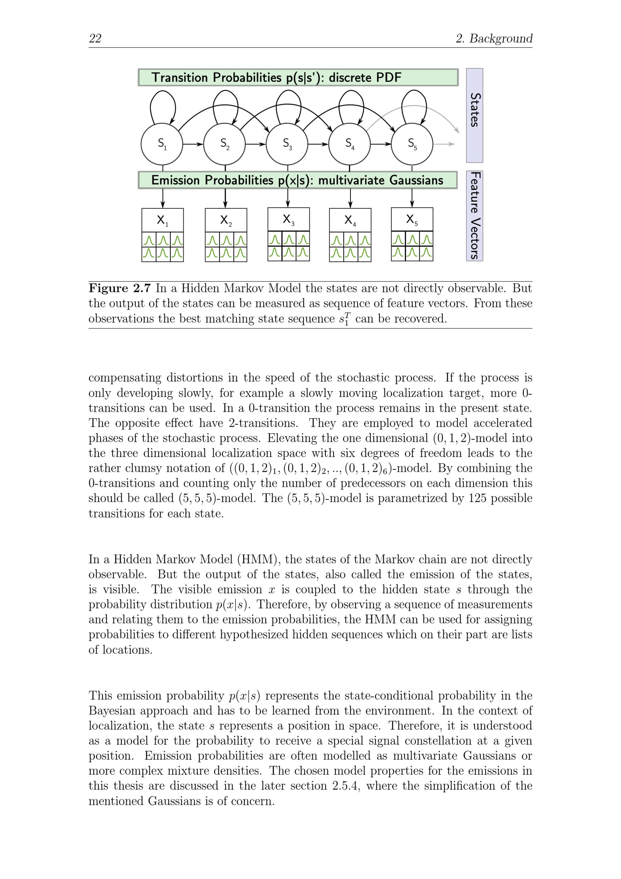 22 2. BackgroundFigure 2.7 In a Hidden Markov Model the states are not directly observable. Butthe output of the states can be measured as sequence of feature vectors. From theseobservations the best matching state sequence s1Tcan be recovered.compensating distortions in the speed of the stochastic process. If the process isonly developing slowly, for example a slowly moving localization target, more 0-transitions can be used. In a 0-transition the process remains in the present state.The opposite effect have 2-transitions. They are employed to model acceleratedphases of the stochastic process. Elevating the one dimensional(0, 1, 2)-model intothe three dimensional localization space with six degrees of freedom leads to therather clumsy notation of((0, 1, 2)1,(0, 1, 2)2,..,(0, 1, 2)6)-model. By combining the0-transitions and counting only the number of predecessors on each dimension thisshould be called(5, 5, 5)-model. The(5, 5, 5)-model is parametrized by 125 possibletransitions for each state.In a Hidden Markov Model(HMM ), the states of the Markov chain are not directlyobservable. But the output of the states, also called the emission of the states,is visible. The visible emission x is coupled to the hidden state s through theprobability distribution p( x| s). Therefore, by observing a sequence of measurementsand relating them to the emission probabilities, the HMM can be used for assigningprobabilities to different hypothesized hidden sequences which on their part are listsof locations.This emission probability p( x| s) represents the state-conditional probability in theBayesian approach and has to be learned from the environment. In the context oflocalization, the state s represents a position in space. Therefore, it is understoodas a model for the probability to receive a special signal constellation at a givenposition. Emission probabilities are often modelled as multivariate Gaussians ormore complex mixture densities. The chosen model properties for the emissions inthis thesis are discussed in the later section 2.5.4, where the simplification of thementioned Gaussians is of concern.