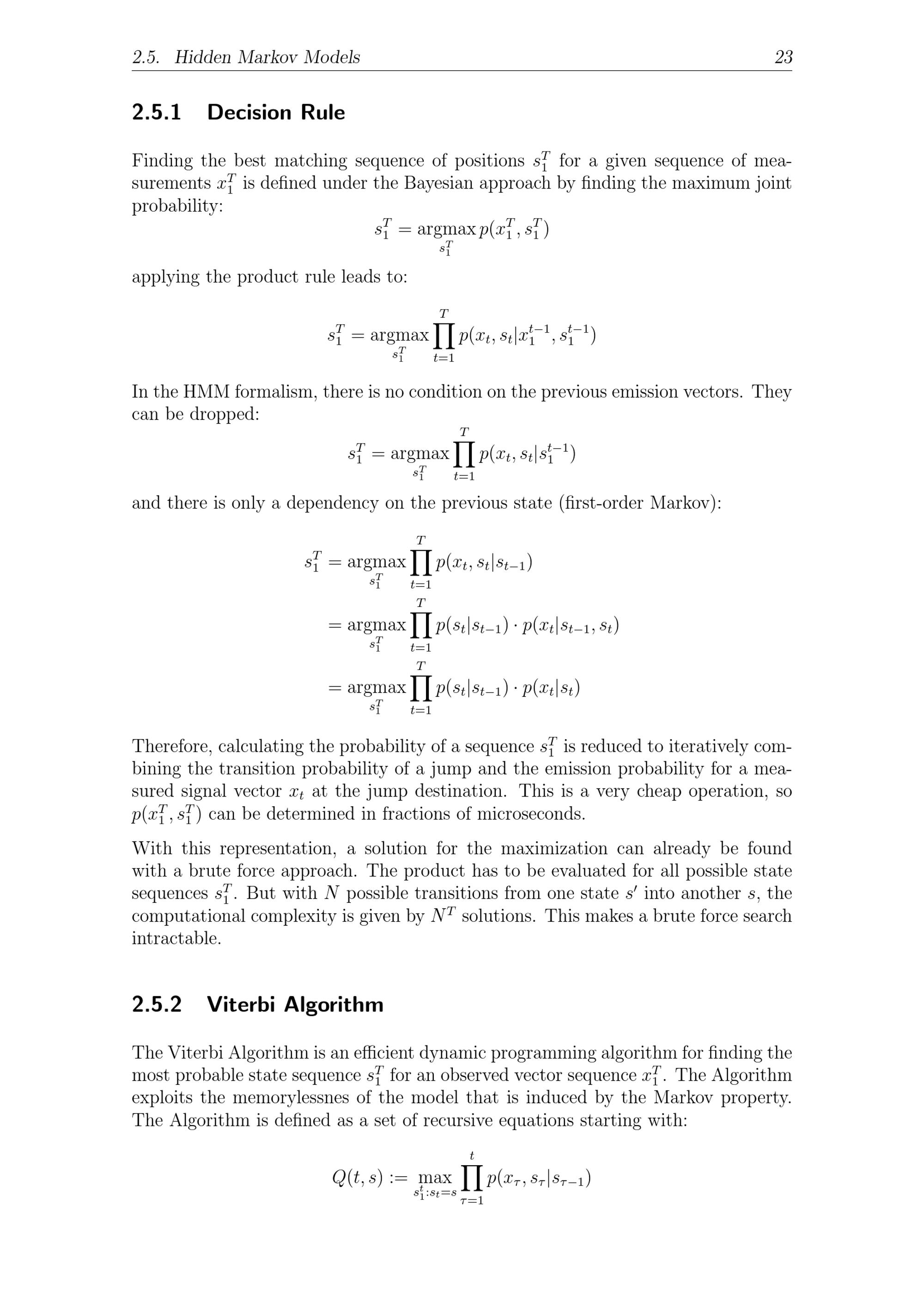 2.5. Hidden Markov Models 232.5.1 Decision RuleFinding the best matching sequence of positions sT1for a given sequence of mea-surements xT1is defined under the Bayesian approach by finding the maximum jointprobability:s1T= argmax p( xT1, sT1)sT1applying the product rule leads to:Ts1T= argmax p( xt, st| x1t- 1, s1t- 1)sT1t=1In the HMM formalism, there is no condition on the previous emission vectors. Theycan be dropped:TsT1= argmax p( xt, st| s1t- 1)sT1t=1and there is only a dependency on the previous state(first-order Markov ):Ts1T= argmax p( xt, st| st- 1)sT1t=1T= argmax p( st| st- 1) · p( xt| st- 1, st)s1Tt=1T= argmax p( st| st- 1) · p( xt| st)sT1t=1Therefore, calculating the probability of a sequence sT1is reduced to iteratively com-bining the transition probability of a jump and the emission probability for a mea-sured signal vector xtat the jump destination. This is a very cheap operation, sop( x1T, sT1) can be determined in fractions of microseconds.With this representation, a solution for the maximization can already be foundwith a brute force approach. The product has to be evaluated for all possible statesequences s1T. But with N possible transitions from one state s into another s, thecomputational complexity is given by NTsolutions. This makes a brute force searchintractable.2.5.2 Viterbi AlgorithmThe Viterbi Algorithm is an efficient dynamic programming algorithm for finding themost probable state sequence sT1for an observed vector sequence x1T. The Algorithmexploits the memorylessnes of the model that is induced by the Markov property.The Algorithm is defined as a set of recursive equations starting with:tQ( t, s):= max p( x, s| s - 1)s1t: st= s=1