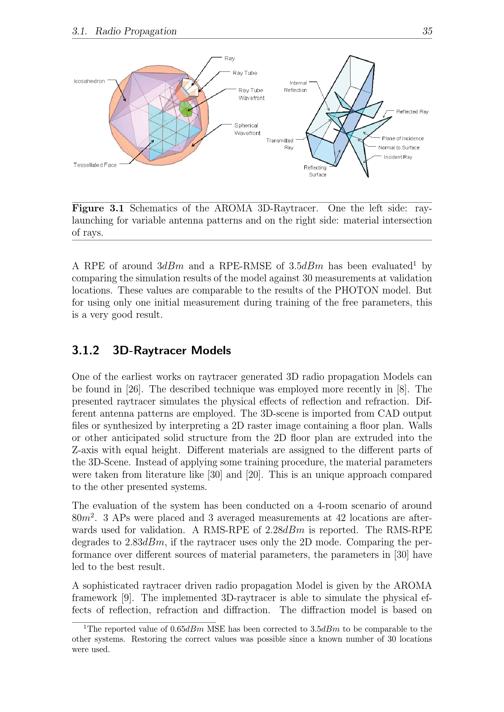 3.1. Radio Propagation 35Figure 3.1 Schematics of the AROMA 3D-Raytracer. One the left side: ray-launching for variable antenna patterns and on the right side: material intersectionof rays.A RPE of around 3 dBm and a RPE-RMSE of 3. 5 dBm has been evaluated1bycomparing the simulation results of the model against 30 measurements at validationlocations. These values are comparable to the results of the PHOTON model. Butfor using only one initial measurement during training of the free parameters, thisis a very good result.3.1.2 3D-Raytracer ModelsOne of the earliest works on raytracer generated 3D radio propagation Models canbe found in[26]. The described technique was employed more recently in[8]. Thepresented raytracer simulates the physical effects of reflection and refraction. Dif-ferent antenna patterns are employed. The 3D-scene is imported from CAD outputfiles or synthesized by interpreting a 2D raster image containing a floor plan. Wallsor other anticipated solid structure from the 2D floor plan are extruded into theZ-axis with equal height. Different materials are assigned to the different parts ofthe 3D-Scene. Instead of applying some training procedure, the material parameterswere taken from literature like[30] and[20]. This is an unique approach comparedto the other presented systems.The evaluation of the system has been conducted on a 4-room scenario of around80 m2. 3 APs were placed and 3 averaged measurements at 42 locations are after-wards used for validation. A RMS-RPE of 2. 28 dBm is reported. The RMS-RPEdegrades to 2. 83 dBm, if the raytracer uses only the 2D mode. Comparing the per-formance over different sources of material parameters, the parameters in[30] haveled to the best result.A sophisticated raytracer driven radio propagation Model is given by the AROMAframework[9]. The implemented 3D-raytracer is able to simulate the physical ef-fects of reflection, refraction and diffraction. The diffraction model is based on1The reported value of 0. 65 dBm MSE has been corrected to 3. 5 dBm to be comparable to theother systems. Restoring the correct values was possible since a known number of 30 locationswere used.