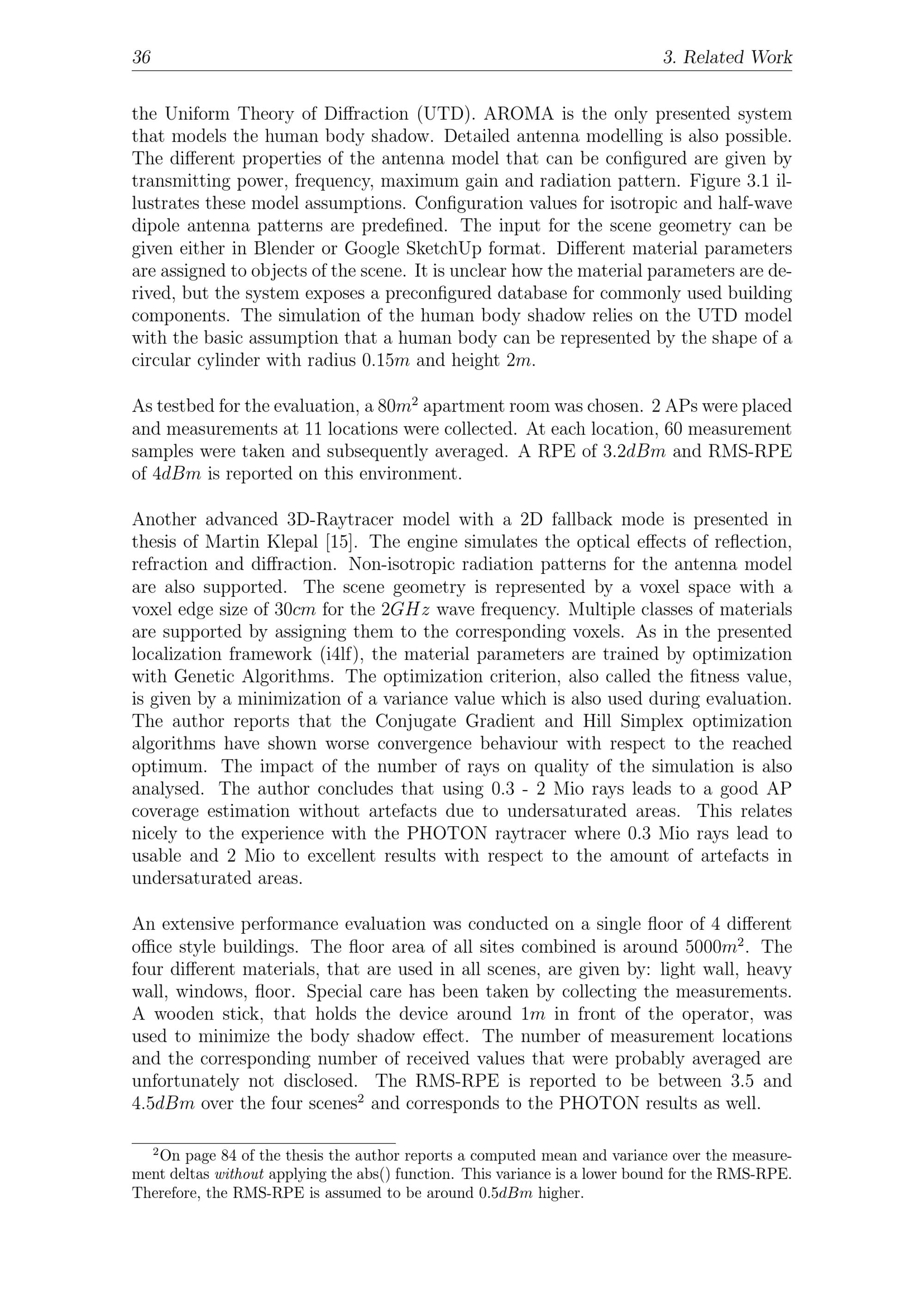 36 3. Related Workthe Uniform Theory of Diffraction(UTD). AROMA is the only presented systemthat models the human body shadow. Detailed antenna modelling is also possible.The different properties of the antenna model that can be configured are given bytransmitting power, frequency, maximum gain and radiation pattern. Figure 3.1 il-lustrates these model assumptions. Configuration values for isotropic and half-wavedipole antenna patterns are predefined. The input for the scene geometry can begiven either in Blender or Google SketchUp format. Different material parametersare assigned to objects of the scene. It is unclear how the material parameters are de-rived, but the system exposes a preconfigured database for commonly used buildingcomponents. The simulation of the human body shadow relies on the UTD modelwith the basic assumption that a human body can be represented by the shape of acircular cylinder with radius 0. 15 m and height 2 m.As testbed for the evaluation, a 80 m2apartment room was chosen. 2 APs were placedand measurements at 11 locations were collected. At each location, 60 measurementsamples were taken and subsequently averaged. A RPE of 3. 2 dBm and RMS-RPEof 4 dBm is reported on this environment.Another advanced 3D-Raytracer model with a 2D fallback mode is presented inthesis of Martin Klepal[15]. The engine simulates the optical effects of reflection,refraction and diffraction. Non-isotropic radiation patterns for the antenna modelare also supported. The scene geometry is represented by a voxel space with avoxel edge size of 30 cm for the 2 GHz wave frequency. Multiple classes of materialsare supported by assigning them to the corresponding voxels. As in the presentedlocalization framework(i4lf), the material parameters are trained by optimizationwith Genetic Algorithms . The optimization criterion, also called the fitness value,is given by a minimization of a variance value which is also used during evaluation.The author reports that the Conjugate Gradient and Hill Simplex optimizationalgorithms have shown worse convergence behaviour with respect to the reachedoptimum. The impact of the number of rays on quality of the simulation is alsoanalysed. The author concludes that using 0.3- 2 Mio rays leads to a good APcoverage estimation without artefacts due to undersaturated areas. This relatesnicely to the experience with the PHOTON raytracer where 0.3 Mio rays lead tousable and 2 Mio to excellent results with respect to the amount of artefacts inundersaturated areas.An extensive performance evaluation was conducted on a single floor of 4 differentoffice style buildings. The floor area of all sites combined is around 5000 m2. Thefour different materials, that are used in all scenes, are given by: light wall, heavywall, windows, floor. Special care has been taken by collecting the measurements.A wooden stick, that holds the device around 1 m in front of the operator, wasused to minimize the body shadow effect. The number of measurement locationsand the corresponding number of received values that were probably averaged areunfortunately not disclosed. The RMS-RPE is reported to be between 3. 5 and4. 5 dBm over the four scenes2and corresponds to the PHOTON results as well.2On page 84 of the thesis the author reports a computed mean and variance over the measure-ment deltas without applying the abs() function. This variance is a lower bound for the RMS-RPE.Therefore, the RMS-RPE is assumed to be around 0. 5 dBm higher.