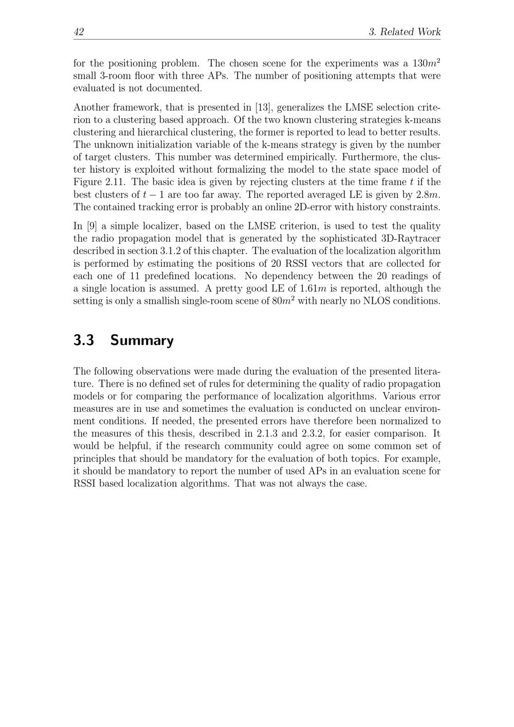 42 3. Related Workfor the positioning problem. The chosen scene for the experiments was a 130 m2small 3-room floor with three APs. The number of positioning attempts that wereevaluated is not documented.Another framework, that is presented in[13], generalizes the LMSE selection crite-rion to a clustering based approach. Of the two known clustering strategies k-meansclustering and hierarchical clustering, the former is reported to lead to better results.The unknown initialization variable of the k-means strategy is given by the numberof target clusters. This number was determined empirically. Furthermore, the clus-ter history is exploited without formalizing the model to the state space model ofFigure 2.11. The basic idea is given by rejecting clusters at the time frame t if thebest clusters of t- 1 are too far away. The reported averaged LE is given by 2. 8 m.The contained tracking error is probably an online 2D-error with history constraints.In[9] a simple localizer, based on the LMSE criterion, is used to test the qualitythe radio propagation model that is generated by the sophisticated 3D-Raytracerdescribed in section 3.1.2 of this chapter. The evaluation of the localization algorithmis performed by estimating the positions of 20 RSSI vectors that are collected foreach one of 11 predefined locations. No dependency between the 20 readings ofa single location is assumed. A pretty good LE of 1. 61 m is reported, although thesetting is only a smallish single-room scene of 80 m2with nearly no NLOS conditions.3.3 SummaryThe following observations were made during the evaluation of the presented litera-ture. There is no defined set of rules for determining the quality of radio propagationmodels or for comparing the performance of localization algorithms. Various errormeasures are in use and sometimes the evaluation is conducted on unclear environ-ment conditions. If needed, the presented errors have therefore been normalized tothe measures of this thesis, described in 2.1.3 and 2.3.2, for easier comparison. Itwould be helpful, if the research community could agree on some common set ofprinciples that should be mandatory for the evaluation of both topics. For example,it should be mandatory to report the number of used APs in an evaluation scene forRSSI based localization algorithms. That was not always the case.