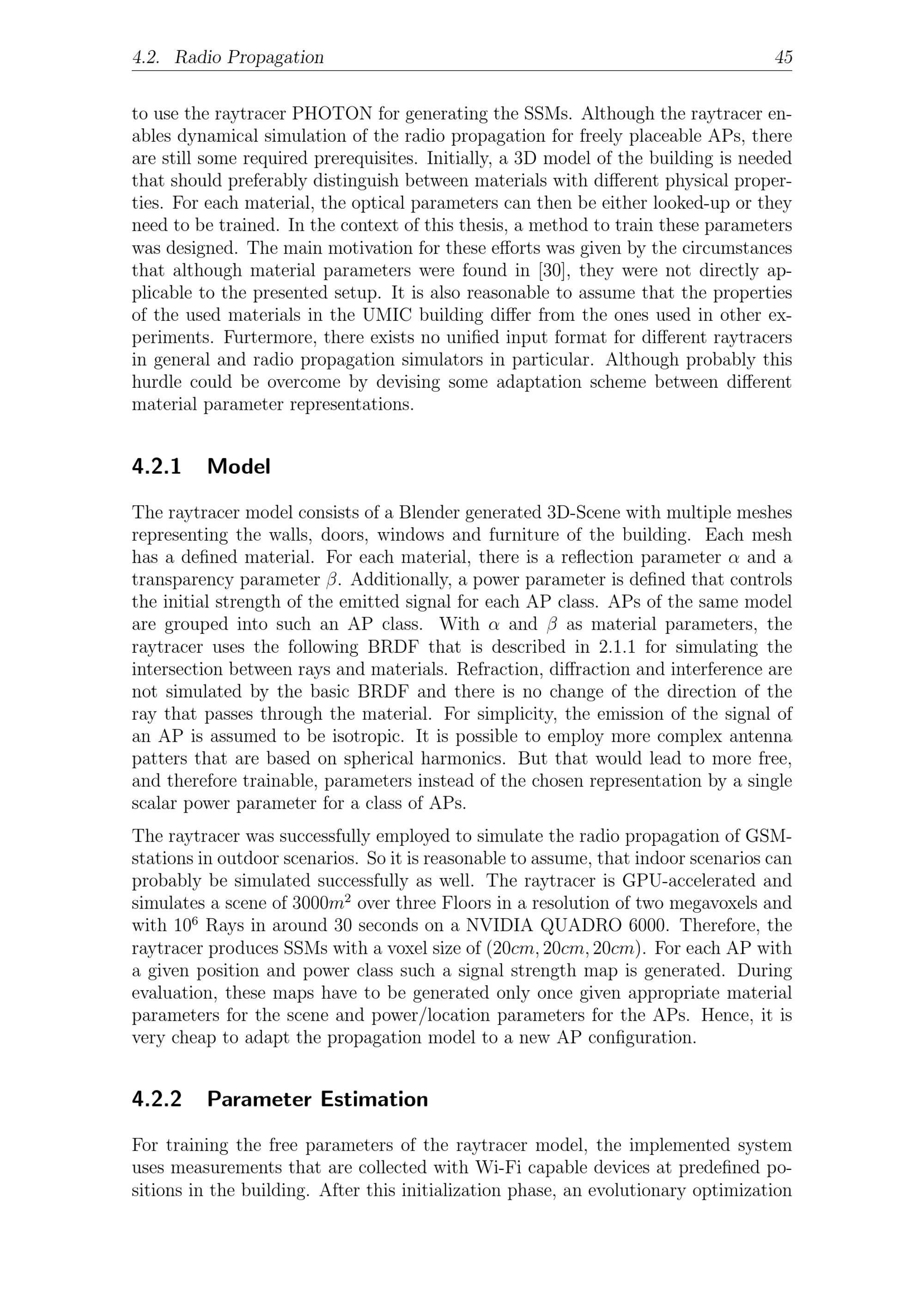 4.2. Radio Propagation 45to use the raytracer PHOTON for generating the SSMs. Although the raytracer en-ables dynamical simulation of the radio propagation for freely placeable APs, thereare still some required prerequisites. Initially, a 3D model of the building is neededthat should preferably distinguish between materials with different physical proper-ties. For each material, the optical parameters can then be either looked-up or theyneed to be trained. In the context of this thesis, a method to train these parameterswas designed. The main motivation for these efforts was given by the circumstancesthat although material parameters were found in[30], they were not directly ap-plicable to the presented setup. It is also reasonable to assume that the propertiesof the used materials in the UMIC building differ from the ones used in other ex-periments. Furtermore, there exists no unified input format for different raytracersin general and radio propagation simulators in particular. Although probably thishurdle could be overcome by devising some adaptation scheme between differentmaterial parameter representations.4.2.1 ModelThe raytracer model consists of a Blender generated 3D-Scene with multiple meshesrepresenting the walls, doors, windows and furniture of the building. Each meshhas a defined material. For each material, there is a reflection parameter and atransparency parameter . Additionally, a power parameter is defined that controlsthe initial strength of the emitted signal for each AP class. APs of the same modelare grouped into such an AP class. With and as material parameters, theraytracer uses the following BRDF that is described in 2.1.1 for simulating theintersection between rays and materials. Refraction, diffraction and interference arenot simulated by the basic BRDF and there is no change of the direction of theray that passes through the material. For simplicity, the emission of the signal ofan AP is assumed to be isotropic. It is possible to employ more complex antennapatters that are based on spherical harmonics. But that would lead to more free,and therefore trainable, parameters instead of the chosen representation by a singlescalar power parameter for a class of APs.The raytracer was successfully employed to simulate the radio propagation of GSM-stations in outdoor scenarios. So it is reasonable to assume, that indoor scenarios canprobably be simulated successfully as well. The raytracer is GPU-accelerated andsimulates a scene of 3000 m2over three Floors in a resolution of two megavoxels andwith 106Rays in around 30 seconds on a NVIDIA QUADRO 6000. Therefore, theraytracer produces SSMs with a voxel size of(20 cm, 20 cm, 20 cm). For each AP witha given position and power class such a signal strength map is generated. Duringevaluation, these maps have to be generated only once given appropriate materialparameters for the scene and power/location parameters for the APs. Hence, it isvery cheap to adapt the propagation model to a new AP configuration.4.2.2 Parameter EstimationFor training the free parameters of the raytracer model, the implemented systemuses measurements that are collected with Wi-Fi capable devices at predefined po-sitions in the building. After this initialization phase, an evolutionary optimization