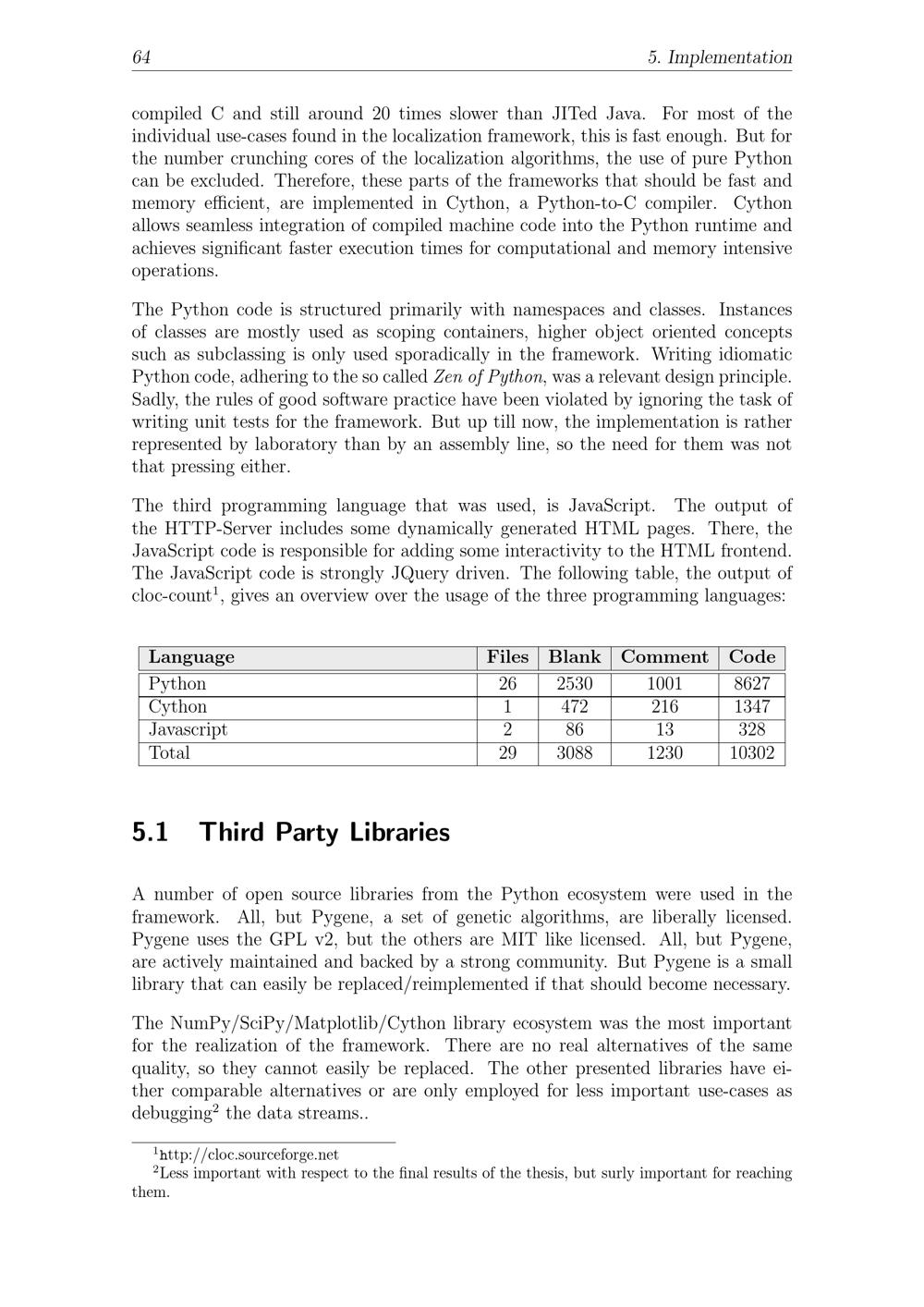 64 5. Implementationcompiled C and still around 20 times slower than JITed Java. For most of theindividual use-cases found in the localization framework, this is fast enough. But forthe number crunching cores of the localization algorithms, the use of pure Python can be excluded. Therefore, these parts of the frameworks that should be fast andmemory efficient, are implemented in Cython, a Python -to-C compiler. Cythonallows seamless integration of compiled machine code into the Python runtime andachieves significant faster execution times for computational and memory intensiveoperations.The Python code is structured primarily with namespaces and classes. Instancesof classes are mostly used as scoping containers, higher object oriented conceptssuch as subclassing is only used sporadically in the framework. Writing idiomaticPython code, adhering to the so called Zen of Python, was a relevant design principle.Sadly, the rules of good software practice have been violated by ignoring the task ofwriting unit tests for the framework. But up till now, the implementation is ratherrepresented by laboratory than by an assembly line, so the need for them was notthat pressing either.The third programming language that was used, is JavaScript. The output ofthe HTTP-Server includes some dynamically generated HTML pages. There, theJavaScript code is responsible for adding some interactivity to the HTML frontend.The JavaScript code is strongly JQuery driven. The following table, the output ofcloc-count1, gives an overview over the usage of the three programming languages:LanguagePythonCythonJavascriptTotalFiles261229Blank2530472863088Comment1001216131230Code86271347328103025.1 Third Party LibrariesA number of open source libraries from the Python ecosystem were used in theframework. All, but Pygene, a set of genetic algorithms, are liberally licensed.Pygene uses the GPL v2, but the others are MIT like licensed. All, but Pygene,are actively maintained and backed by a strong community. But Pygene is a smalllibrary that can easily be replaced/reimplemented if that should become necessary.The NumPy/SciPy/Matplotlib/Cython library ecosystem was the most importantfor the realization of the framework. There are no real alternatives of the samequality, so they cannot easily be replaced. The other presented libraries have ei-ther comparable alternatives or are only employed for less important use-cases asdebugging2the data streams..1http://cloc.sourceforge.net2Less important with respect to the final results of the thesis, but surly important for reachingthem.