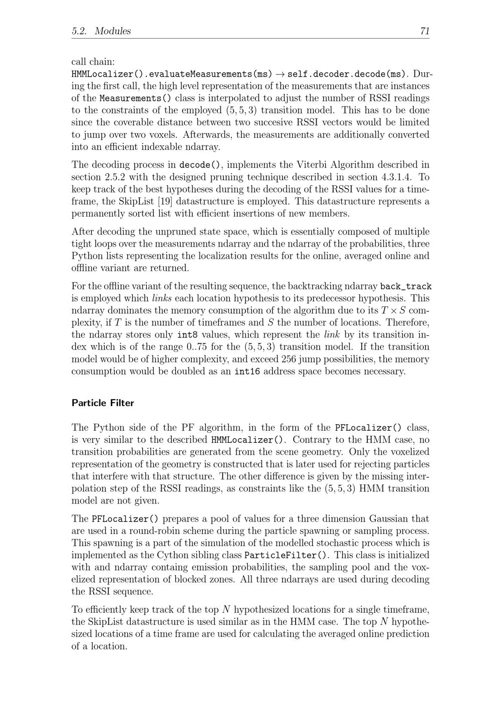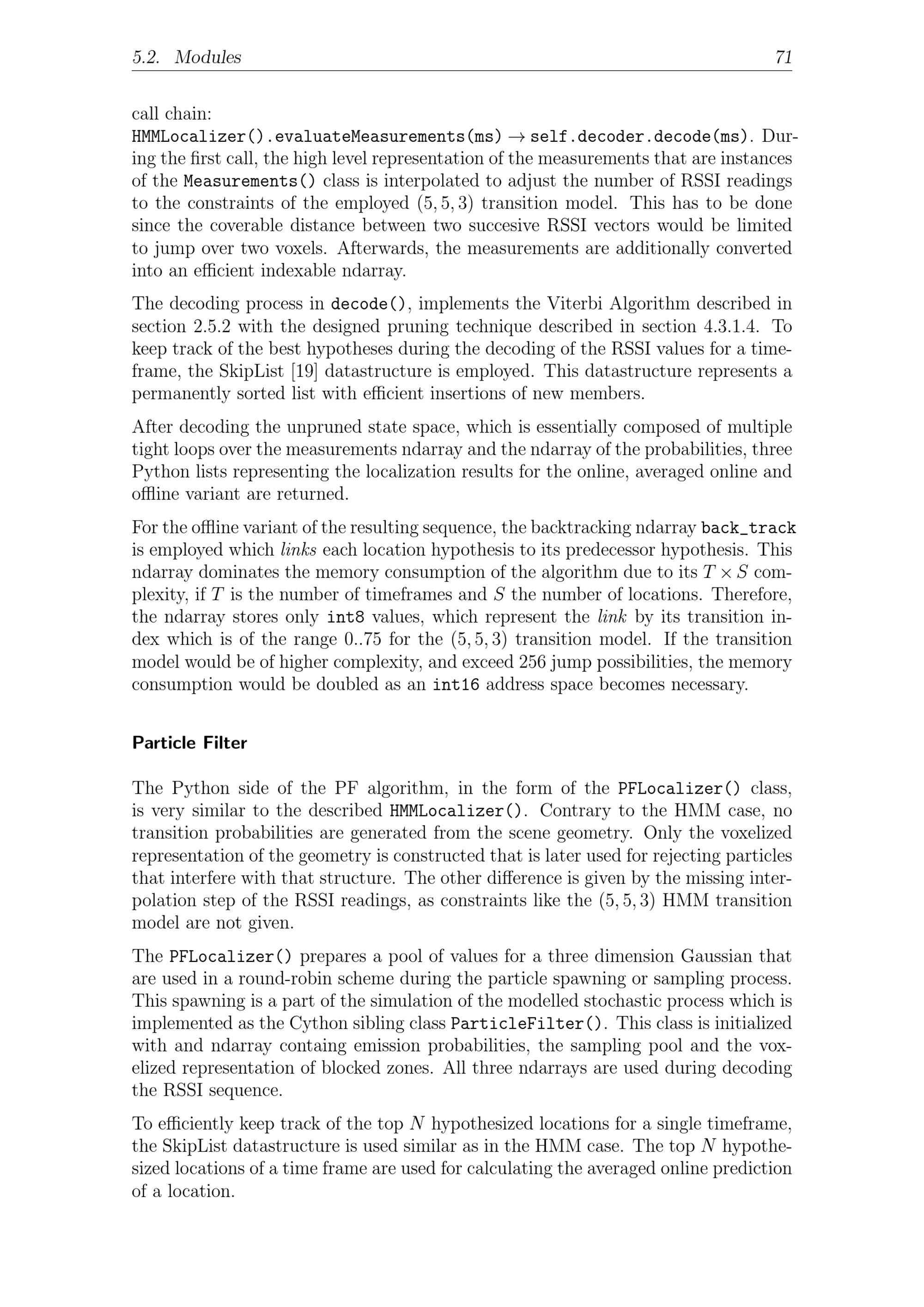 5.2. Modules 71call chain:HMMLocalizer().evaluateMeasurements(ms)self.decoder.decode(ms). Dur-ing the first call, the high level representation of the measurements that are instancesof theMeasurements()class is interpolated to adjust the number of RSSI readingsto the constraints of the employed(5, 5, 3) transition model. This has to be donesince the coverable distance between two succesive RSSI vectors would be limitedto jump over two voxels. Afterwards, the measurements are additionally convertedinto an efficient indexable ndarray.The decoding process indecode(), implements the Viterbi Algorithm described insection 2.5.2 with the designed pruning technique described in section 4.3.1.4. Tokeep track of the best hypotheses during the decoding of the RSSI values for a time-frame, the SkipList[19] datastructure is employed. This datastructure represents apermanently sorted list with efficient insertions of new members.After decoding the unpruned state space, which is essentially composed of multipletight loops over the measurements ndarray and the ndarray of the probabilities, threePython lists representing the localization results for the online, averaged online andoffline variant are returned.For the offline variant of the resulting sequence, the backtracking ndarrayback_trackis employed which links each location hypothesis to its predecessor hypothesis. Thisndarray dominates the memory consumption of the algorithm due to its T × S com-plexity, if T is the number of timeframes and S the number of locations. Therefore,the ndarray stores onlyint8values, which represent the link by its transition in-dex which is of the range 0.. 75 for the(5, 5, 3) transition model. If the transitionmodel would be of higher complexity, and exceed 256 jump possibilities, the memoryconsumption would be doubled as anint16address space becomes necessary.Particle FilterThe Python side of the PF algorithm, in the form of thePFLocalizer()class,is very similar to the describedHMMLocalizer(). Contrary to the HMM case, notransition probabilities are generated from the scene geometry. Only the voxelizedrepresentation of the geometry is constructed that is later used for rejecting particlesthat interfere with that structure. The other difference is given by the missing inter-polation step of the RSSI readings, as constraints like the(5, 5, 3) HMM transitionmodel are not given.ThePFLocalizer()prepares a pool of values for a three dimension Gaussian thatare used in a round-robin scheme during the particle spawning or sampling process.This spawning is a part of the simulation of the modelled stochastic process which isimplemented as the Cython sibling classParticleFilter(). This class is initializedwith and ndarray containg emission probabilities, the sampling pool and the vox-elized representation of blocked zones. All three ndarrays are used during decodingthe RSSI sequence.To efficiently keep track of the top N hypothesized locations for a single timeframe,the SkipList datastructure is used similar as in the HMM case. The top N hypothe-sized locations of a time frame are used for calculating the averaged online predictionof a location.