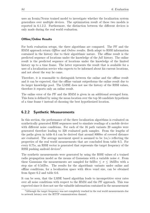 84 6. Evaluationuses an Iconia/Nexus trained model to investigate whether the localization systemgeneralizes over multiple devices. The optimization result of these two models isreported in 6.1.2.2. Furthermore, the distinction between the different devices isonly made during the real world evaluation.Offline/Online ResultsFor both evaluation setups, the three algorithms are compared. The PF and theHMM approach return Offline and Online results. Both adapt to RSSI informationcontained in the history due to their algorithmic nature. The offline result is thepredicted sequence of locations under the knowledge of the full history. The onlineresult is the predicted sequence of locations under the knowledge of the limitedhistory up to a time frame. The latter represents the result that is available for auser of a localization service who expects to be informed about his current locations,and not about the way he came.Therefore, it is reasonable to distinguish between the online and the offline resultand it can be expected, that the offline variant outperforms the online result due toits larger knowledge pool. The LMSE does not use the history of the RSSI values,therefore it reports only an online result.The online error of the PF and the HMM is given in an additional averaged form.This form is defined by using the mean location over the top 50 candidate hypothesisof a time frame t instead of choosing the best hypothesized location.6.2.2 Synthetic MeasurementsIn this section, the performance of the three localization algorithms is evaluated onsynthetically generated RSSI sequences used to simulate readings of a mobile devicewith different noise conditions. For each of the 16 path variants 20 samples weregenerated therefore leading to 320 evaluated path samples. From the lengths ofthe paths given in table 6.4 can be derived that around 8000 m of covered distanceare evaluated. The average movement speed is assumed to be 1 m/s reflecting theproperties of the real world measurements that are concluded from table 6.5. Forevery 0. 75 s, an RSSI vector is generated that represents the target frequency of theRSSI pushing android devices4.The synthetic measurements were generated by using the RSSI values of a trainedradio propagation model as the means of Gaussians with a variable noise . Fromthese Gaussians the measurements are sampled for 0 dBm 18 dBm with astep size of 0. 5 dBm. The results for the algorithmic variants under online andoffline conditions, for a localization space with 40 cm voxel size, can be obtainedfrom figure 6.2 and table 6.6.It can be seen, that the LMSE based algorithm leads to incompetitive error ratesover all noise conditions with respect to the HMM and the PF approach. This wasexpected since it does not use the valuable information contained in the measurement4Although the target frequency was not completely reached in the real world measurements dueto network latency over the HTTP communication channel.