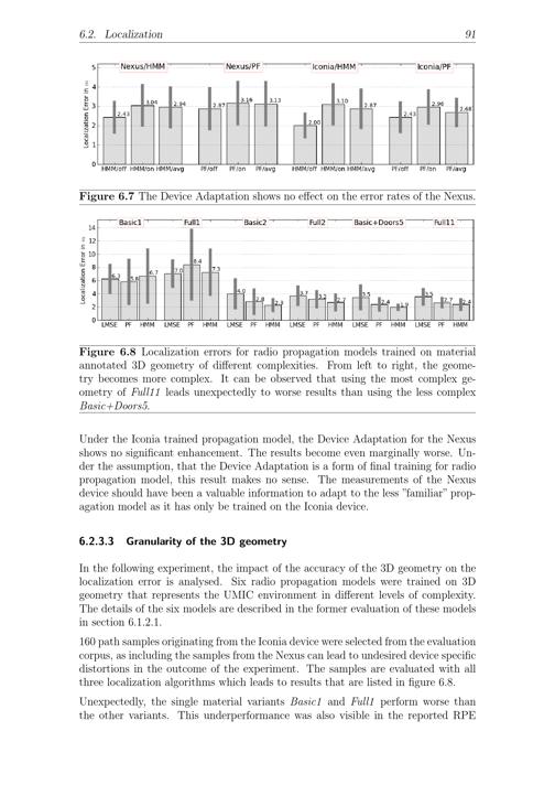 6.2. Localization 91Figure 6.7 The Device Adaptation shows no effect on the error rates of the Nexus.Figure 6.8 Localization errors for radio propagation models trained on materialannotated 3D geometry of different complexities. From left to right, the geome-try becomes more complex. It can be observed that using the most complex ge-ometry of Full11 leads unexpectedly to worse results than using the less complexBasic+Doors5.Under the Iconia trained propagation model, the Device Adaptation for the Nexusshows no significant enhancement. The results become even marginally worse. Un-der the assumption, that the Device Adaptation is a form of final training for radiopropagation model, this result makes no sense. The measurements of the Nexusdevice should have been a valuable information to adapt to the less"familiar" prop-agation model as it has only be trained on the Iconia device.6.2.3.3 Granularity of the 3D geometryIn the following experiment, the impact of the accuracy of the 3D geometry on thelocalization error is analysed. Six radio propagation models were trained on 3Dgeometry that represents the UMIC environment in different levels of complexity.The details of the six models are described in the former evaluation of these modelsin section 6.1.2.1.160 path samples originating from the Iconia device were selected from the evaluationcorpus, as including the samples from the Nexus can lead to undesired device specificdistortions in the outcome of the experiment. The samples are evaluated with allthree localization algorithms which leads to results that are listed in figure 6.8.Unexpectedly, the single material variants Basic1 and Full1 perform worse thanthe other variants. This underperformance was also visible in the reported RPE