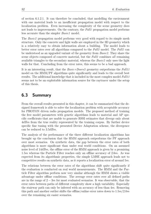 92 6. Evaluationof section 6.1.2.1. It can therefore be concluded, that modelling the environmentwith one material leads to an insufficient propagation model with respect to thelocalization problem. Even increasing the complexity of the scene geometry doesnot leads to improvements. On the contrary, the Full1 propagation model performsless accurate than the simpler Basic1 model.The Basic2 propagation model performs very good with regard to its simple meshstructure. Only the concrete and light walls are employed in the 3D geometry whichis a relatively easy to obtain information about a building. The model leads tobetter error rates over all algorithms compared to the Full2 model. The Full2 canbe understood as an upgraded variant of the geometry from Basic2. They share thescene objects composed of concrete material, but the Full2 combines all remainingavailable triangles to the secondary material, whereas the Basic2 only uses the lightwalls for that. Concluding from the error rates, this seems to be a bad approach.It is an interesting result, that the Basic+Doors5 geometry outperforms the Full11model on the HMM/PF algorithms quite significantly and leads to the overall bestresults. The additional knowledge that is included in the most complex model Full11seems not to be an exploitable information source for the raytracer under the setupof this thesis.6.3 SummaryFrom the overall results presented in this chapter, it can be summarized that the de-signed framework is able to solve the localization problem with acceptable accuracyfor PHOTON driven radio propagation models. The proposed method of trainingthe free model parameters with genetic algorithms leads to material and AP spe-cific coefficients that are usable to generate RSSI estimates that diverge only about4 dBm from the true reality represented by the training corpus. By further devicespecific fine tuning with the presented Device Adaptation scheme, the divergencecan be reduced to 3. 5 dBm.The analysis of the performance of the three different localization algorithms hasbrought up the conclusion that the HMM approach outperforms the PF approachover most scenarios. On synthetic data, the gap between the error rates of bothalgorithms is more significant than under real world conditions. On an assumednoise level of 14 dBm, the offline error of the HMM approach is given by a promising1. 5 m whereas the Particle Filter reaches only an offline accuracy of 2. 6 m. As wasexpected from its algorithmic properties, the simple LMSE approach leads not tocompetitive results on synthetic data, as it reports a localization error of around 5 m.The relations between the error rates of the algorithms shift quite significantly ifthe evaluation is conducted on real world measurements. The HMM and the Par-ticle Filter algorithm perform now very similar although the HMM shows a visibleadvantage under offline conditions. The average error rates over all defined pathsare in the range of 2- 3 m for most evaluated scenarios. It was observable, that theerror rates between paths of different complexity show a high variability. Especiallythe stairway path can only be inferred with an accuracy of less than 4 m. Removingthis path and another outlier shifts the offline/online error rates down to 1. 5 m/ 2. 0 mover the remaining six easier scenarios.