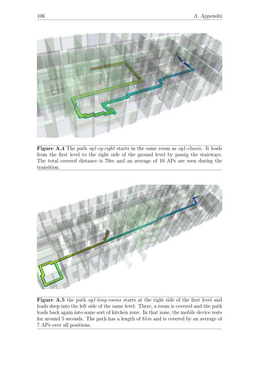 106 A. AppendixFigure A.4 The path og1-eg-right starts in the same room as og1-classic. It leadsfrom the first level to the right side of the ground level by passig the stairways.The total covered distance is 70 m and an average of 10 APs are seen during thetransition.Figure A.5 the path og1-long-rooms starts at the right side of the first level andleads deep into the left side of the same level. There, a room is covered and the pathleads back again into some sort of kitchen zone. In that zone, the mobile device restsfor around 5 seconds. The path has a length of 81 m and is covered by an average of7 APs over all positions.