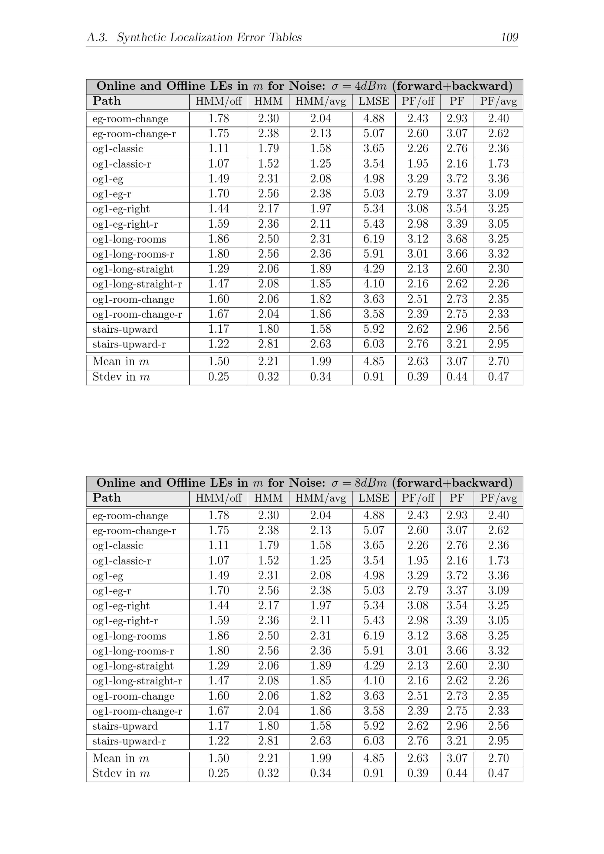 A.3. Synthetic Localization Error Tables 109Online and Offline LEs in m for Noise: = 4 dBm(forward+ backward)PathHMM/off HMM HMM/avg LMSE PF/off PF PF/avgeg-room-change1.78 2.30 2.04 4.88 2.43 2.93 2.40eg-room-change-r1.75 2.38 2.13 5.07 2.60 3.07 2.62og1-classic1.11 1.79 1.58 3.65 2.26 2.76 2.36og1-classic-r1.07 1.52 1.25 3.54 1.95 2.16 1.73og1-eg1.49 2.31 2.08 4.98 3.29 3.72 3.36og1-eg-rog1-eg-rightog1-eg-right-rog1-long-rooms1.70 2.56 2.38 5.03 2.79 3.37 3.091.44 2.17 1.97 5.34 3.08 3.54 3.251.59 2.36 2.11 5.43 2.98 3.39 3.051.86 2.50 2.31 6.19 3.12 3.68 3.25og1-long-rooms-r1.80 2.56 2.36 5.91 3.01 3.66 3.32og1-long-straight1.29 2.06 1.89 4.29 2.13 2.60 2.30og1-long-straight-r1.47 2.08 1.85 4.10 2.16 2.62 2.26og1-room-change1.60 2.06 1.82 3.63 2.51 2.73 2.35og1-room-change-r1.67 2.04 1.86 3.58 2.39 2.75 2.33stairs-upwardstairs-upward-r1.17 1.80 1.58 5.92 2.62 2.96 2.561.22 2.81 2.63 6.03 2.76 3.21 2.95Mean in m 1.50 2.21 1.99 4.85 2.63 3.07 2.70Stdev in m 0.25 0.32 0.34 0.91 0.39 0.44 0.47Online and Offline LEs in m for Noise: = 8 dBm(forward+ backward)PathHMM/off HMM HMM/avg LMSE PF/off PF PF/avgeg-room-change1.78 2.30 2.04 4.88 2.43 2.93 2.40eg-room-change-r1.75 2.38 2.13 5.07 2.60 3.07 2.62og1-classic1.11 1.79 1.58 3.65 2.26 2.76 2.36og1-classic-r1.07 1.52 1.25 3.54 1.95 2.16 1.73og1-eg1.49 2.31 2.08 4.98 3.29 3.72 3.36og1-eg-rog1-eg-rightog1-eg-right-rog1-long-rooms1.70 2.56 2.38 5.03 2.79 3.37 3.091.44 2.17 1.97 5.34 3.08 3.54 3.251.59 2.36 2.11 5.43 2.98 3.39 3.051.86 2.50 2.31 6.19 3.12 3.68 3.25og1-long-rooms-r1.80 2.56 2.36 5.91 3.01 3.66 3.32og1-long-straight1.29 2.06 1.89 4.29 2.13 2.60 2.30og1-long-straight-r1.47 2.08 1.85 4.10 2.16 2.62 2.26og1-room-change1.60 2.06 1.82 3.63 2.51 2.73 2.35og1-room-change-r1.67 2.04 1.86 3.58 2.39 2.75 2.33stairs-upwardstairs-upward-r1.17 1.80 1.58 5.92 2.62 2.96 2.561.22 2.81 2.63 6.03 2.76 3.21 2.95Mean in m 1.50 2.21 1.99 4.85 2.63 3.07 2.70Stdev in m 0.25 0.32 0.34 0.91 0.39 0.44 0.47