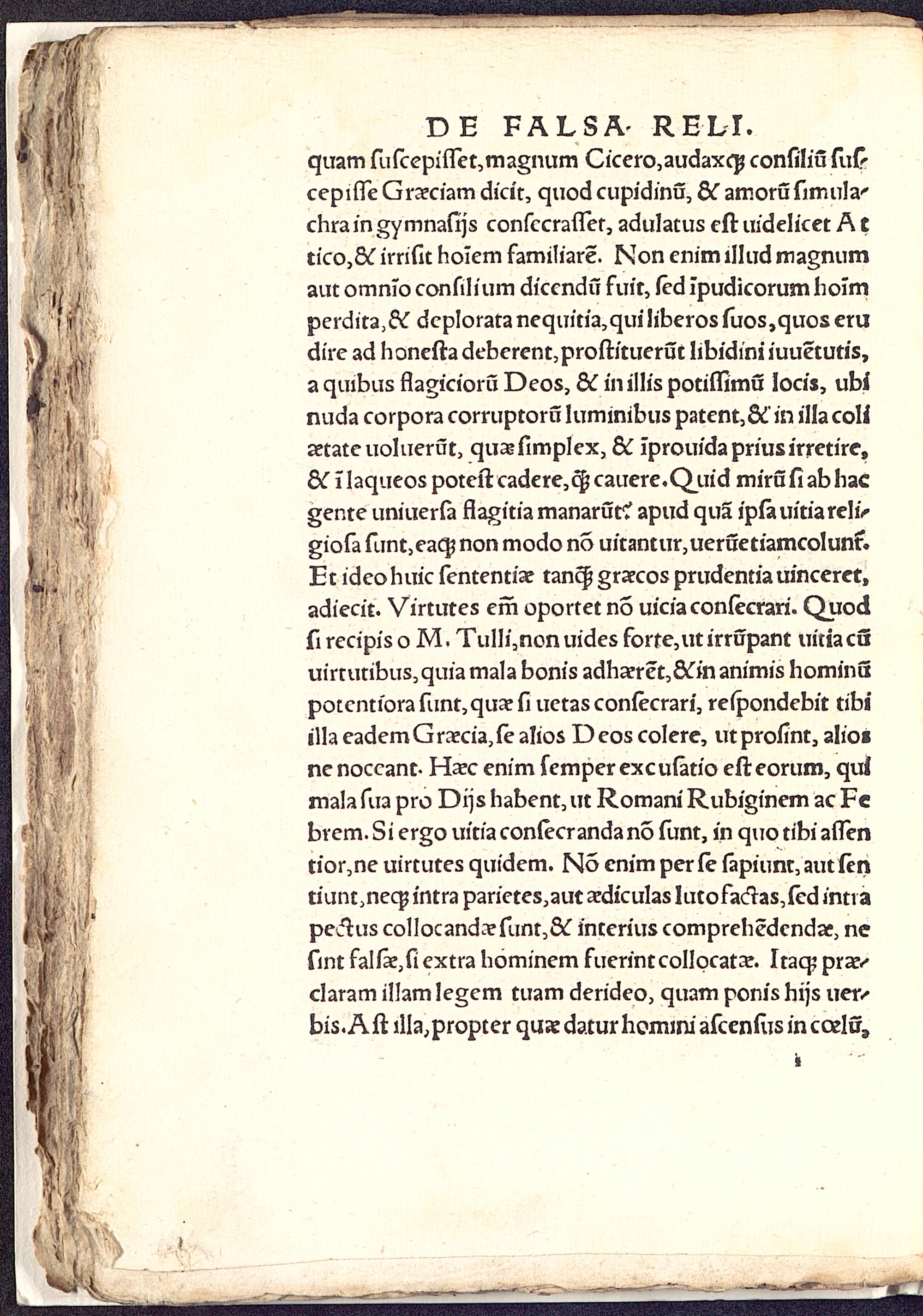 qaam fufcepiflet,magnum Cicero,audaxc$ confiliufufrcepifle Grxciam dtdt, quod cupidinu, &T amorufimuIa<'chraingymnafrjs confccraflet, adulatus eft uidelicet A Ctico,&f irrifit hoiem familiare. Non enim lllud magnumaut omnio confilium diccndu fuit, ied Ipudicorum hoirnperdita.cV dcplorata nequitia,quiIiberos fuos,quos erudire ad honefta debcrent,proftituerut Iibidini iuuetutis,aquibusflagicioruDeos, dC inillispotiflimu locis, ubinuda corporacorruptoruluminibuspatentj&inillacoliaetateuoluerut, quasfimplcx, &C iprouidapriusirretire,&C ilaqueos poteftcadere,c|jcauere.Quid mirufiabhacgente uniuerla flagitia manarut? apud qua ipfauitiarehVgiofa funt 5 eac£ non modo no uitantur,ueruetiamcolunf.Et ideohuic fententiae tancjj graecos prudentia uinceret,adiecit. Virtutes ern oportet no uicia confecrari. Quodfi recipis o M. TulIi,non uides forte,ut irrupant uitia cuuirtutibus,quiamala bonis adhaeret,&inanimis hominupotcntiorafunt,quaefi uetas conlecrari, reipondebit tibiilla eademGraecia,fe alios Deos colere, utprofint, alioinenoccant- Haec enim femperexculatio efteorum, quimala fua pro Drjs habent, ut Romani Rubigtnem ac Febrem. Si ergo uitia conlecranda no funt, in quo tibi aflentior,ne uirtutes quidem. No cnim perfe iapiunt,autfentiunt ,neq; intra parietes,aut xdiculas IutofacTas,(ed intvapcftus collocanda?funt,& interius comprehedcndae, nefint falfae,fiextra hominem fuerintcollocatae. Itaq? pravclaram illam legem tuam derideo, quam ponis hijs ueivbis.Aft ilIa,propter quaedaturhominiafcenfiisinccelu,